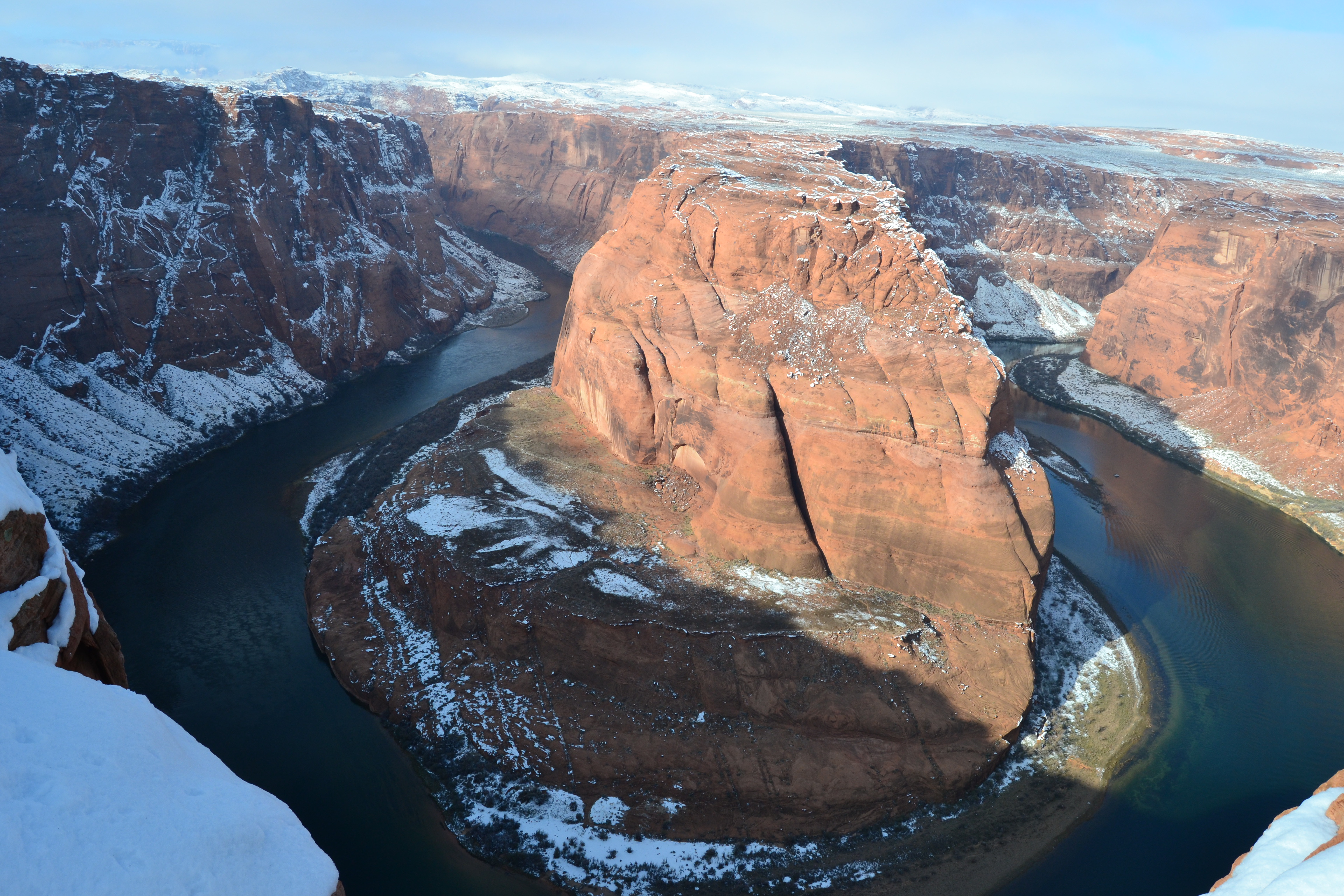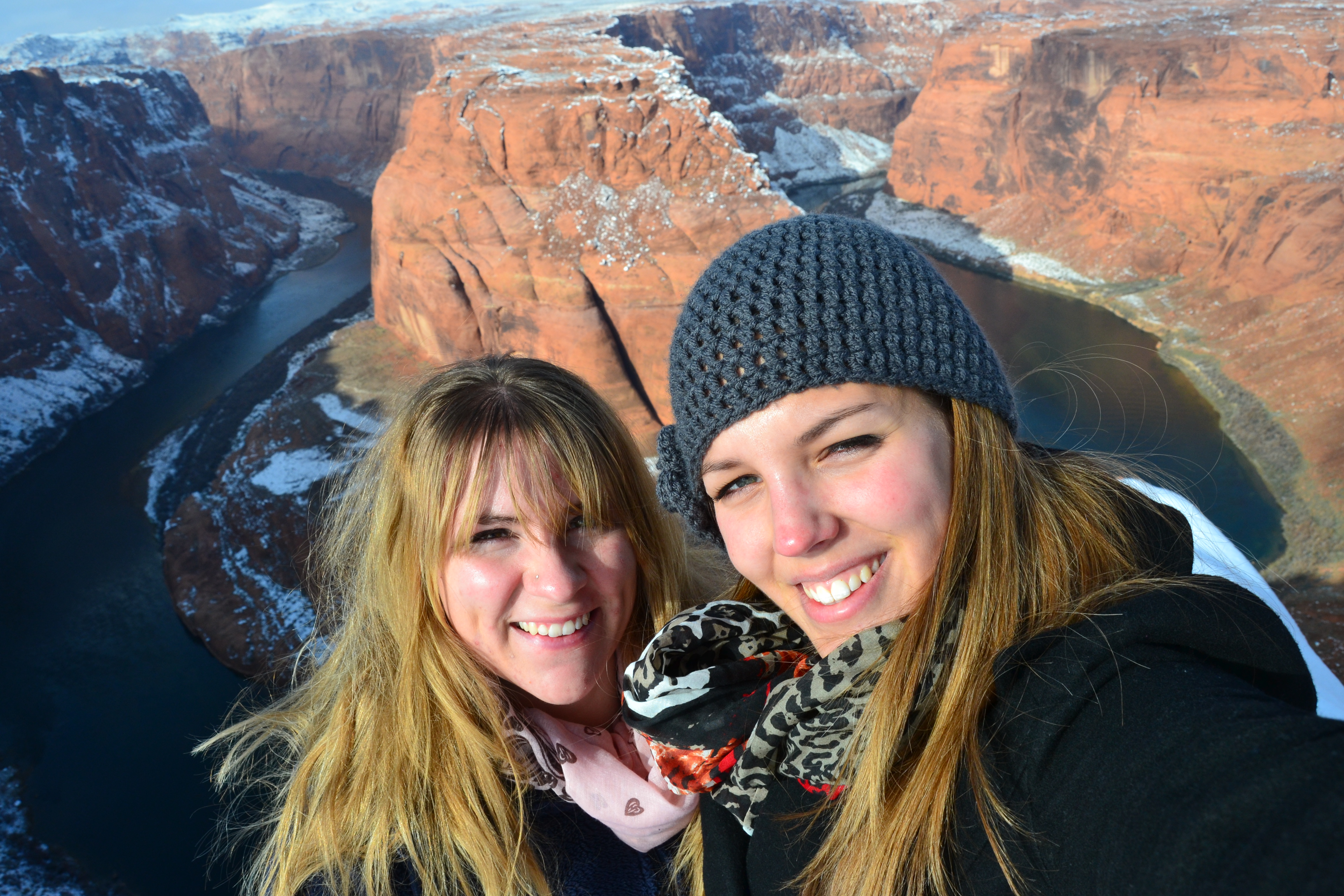 Das nächste Ziel war der nahegelegene Horseshoe-Bend (danke Dominik nochmal für den Tipp). Wie der Name schon sagt, sieht der große Felsen aus wie ein Pferdeschuh, drum rum fließt der Colorado-River und daneben staut sich der Lake Powell zum Glen Canyon Dam. Es war sehr rutschig und wenn man bedenkt, dass es da 300m runter geht und es keine Absperrung oder einen Zaun gibt, ist es da nicht ganz ungefährlich. Sehr mutig sind wir aber ganz dicht vor den Abgrund gestanden um eine gute Sicht zu haben.