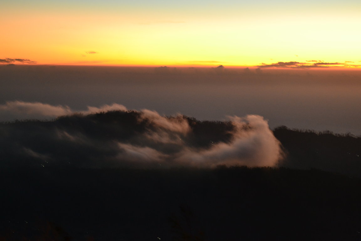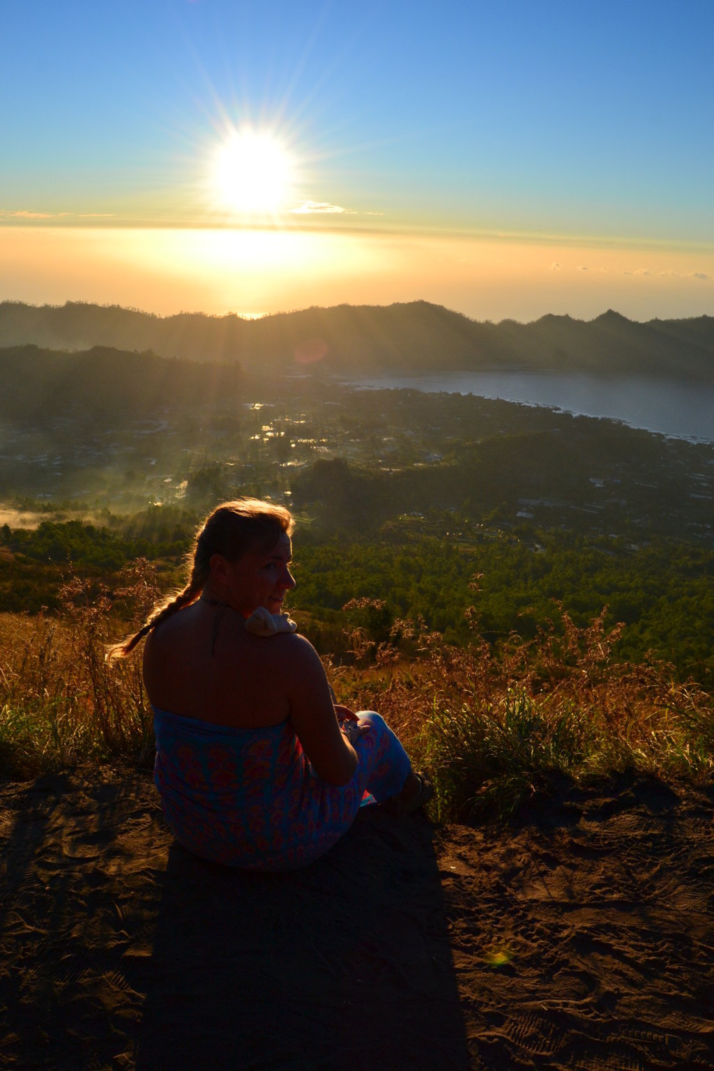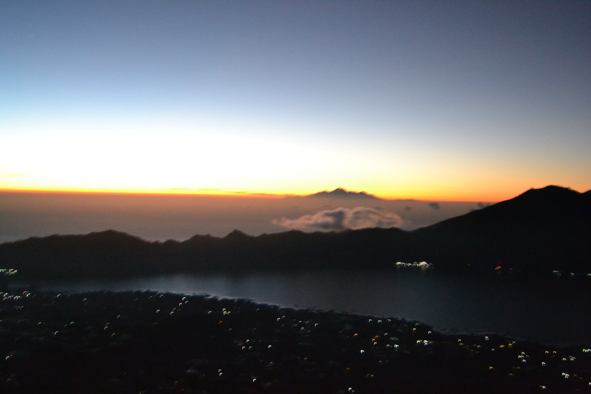 Im stockdunkeln trafen wir uns auf dem Parkplatz mit Guide Nada und seiner süßen, 11 jährigen Tochter. Bewaffnet mit 4 Taschenlampen machten wir uns zum Aufstieg in eisiger Kälte (in Bali ists ja warm da braucht man keine Jacke dachte ich. Saskia war da schlauer, zumal Vicky es uns vorher gesagt hatte). Am Anfang ging es noch einfach und war gechillt. Der Sternenhimmel war atemberaubend. Nach einer Weile wurden die Anstiege steiler, die Steine größer, die Kondition weniger und die Pausen mehr. Leider hat Nada überhaupt nicht drauf geachtet, wo ich als Letzte bleibe und irgendwann konnte ich das sehr sehr stramme Tempo nicht mehr mithalten, obwohl er immer sagte wir können langsam laufen. Dazu kam noch, dass mein Gleichgewichtssinn wegen meinem Ohr das komplett zu war, ausfiel und ich mit meinen Schuhen ständig abrutschte. Dadurch dass es ja dunkel war, konnte man sich leicht verlieren. Aus dem Wandern wurde Klettern wie an der Kletterwand und mit einem schweren Rucksack ist das nicht einfach. Ich habe aufgehört zu zählen wie oft ich den Guide und das Klettern verflucht habe, wie viele Schweißperlen ich auf dem Vulkan gelassen hab und wie oft ich dachte ich komme nicht mehr oben an. Saskia und Vroni: Unsere Wanderung auf Koh Tao war nix dagegen ! Nach eineinhalb Stunden erzählte uns der Guide, dass dies unser Ziel wäre. Ich freute mich wie ein Schneekönig, aber leider zu früh. Nada sagte wir müssen nur noch 3 min. laufen und wären am eigentlichen Ziel. Mit den letzten Kräften schleppte ich mich weiter den steilen, rutschigen, steinigen Berg hoch aber aus den 3 min. wurde eine halbe Stunde und ich war sehr böse auf Nada, weil es ihn nicht interessiert hat, als ich gesagt habe ich kann nicht mehr und obwohl er ständig gesagt hat, dass wir es langsam angehen, hat er nie auf uns geachtet. Seine Tochter war aber zuckersüß und hielt mir ständig die Hand hin, sodass ich mich hochziehen konnte. Sie muss das jeden Tag machen und ist top fit und sehr flink. Auch unsere Fragen zum Vulkan konnte Nada nicht beantworten, weil sein englisch viel zu schlecht war. Er sagte, dass es 3 verschiedene Touren gibt und die Schwerste bis ganz an den Gipfel führt, aber er konnte uns nicht sagen, wie lange welche dauert, weil er es nicht verstanden hat. Nach den schwersten 2 Stunden meines Lebens kamen wir endlich oben an (das war wohl die „leichte“ Tour) und ich war heilfroh. Das Problem war nur, dass es außer einem zugigen Unterstand nichts gab und es noch über einen Stunde bis zum Sonnenaufgang war. Nassgeschwitzt froren wir sehr arg und als uns unsere Lunchbox (1 Ei, 1 Orange und 1 lappriges Brötchen ohne was) ausgehändigt wurde fragten wir uns, warum wir dafür 5$ hinblätterten.