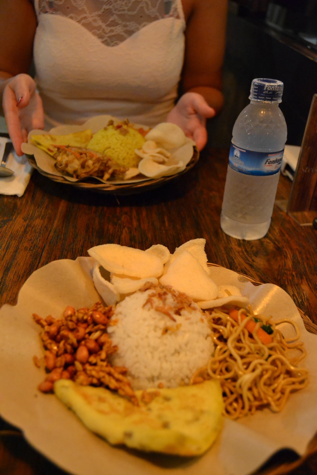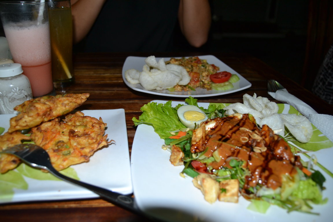 Von ihm haben wir eine gute Wegbeschreibung zum Markt bekommen. Als wir gefühlt in der Nähe waren, fragten wir in einem Restaurant wo der Markt sei. Die Besitzerin teilte uns mit, dass wir uns auf diesem befinden – ups ! Er war sehr klein und es gab nicht viel und so ließen wir uns in diesem Restaurant nieder. Ein Pärchen sagte uns, dass sie seit einem Monat jeden Tag dort hin kommen würden. Sie versprachen nicht zu viel ! Das Essen kommt dem Thailändischen sehr nahe. So bestellte ich frittiertes Gemüse (vegetable fritter) und Gado Gado (frisches Gemüse und Erdnusssoße) und Saskia aß Nasi Goreng (Reisnudeln mit Chicken).