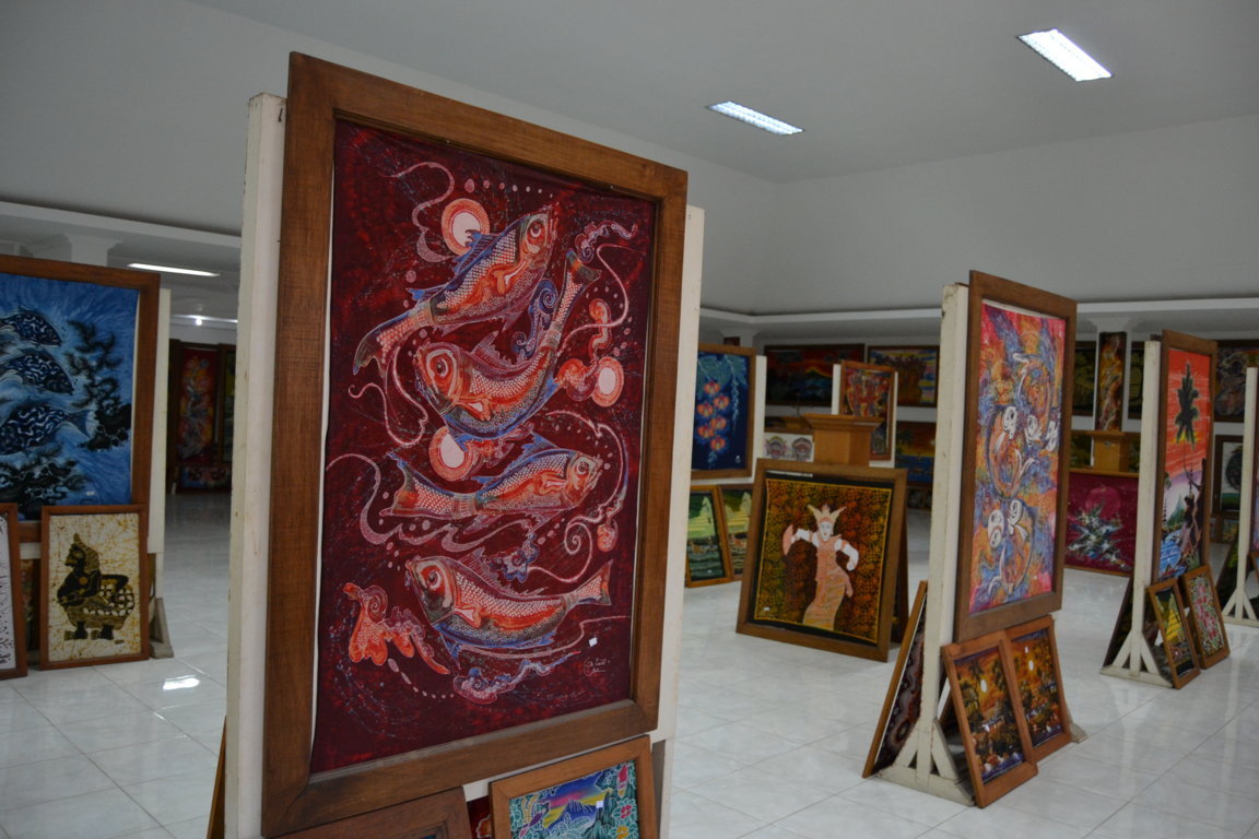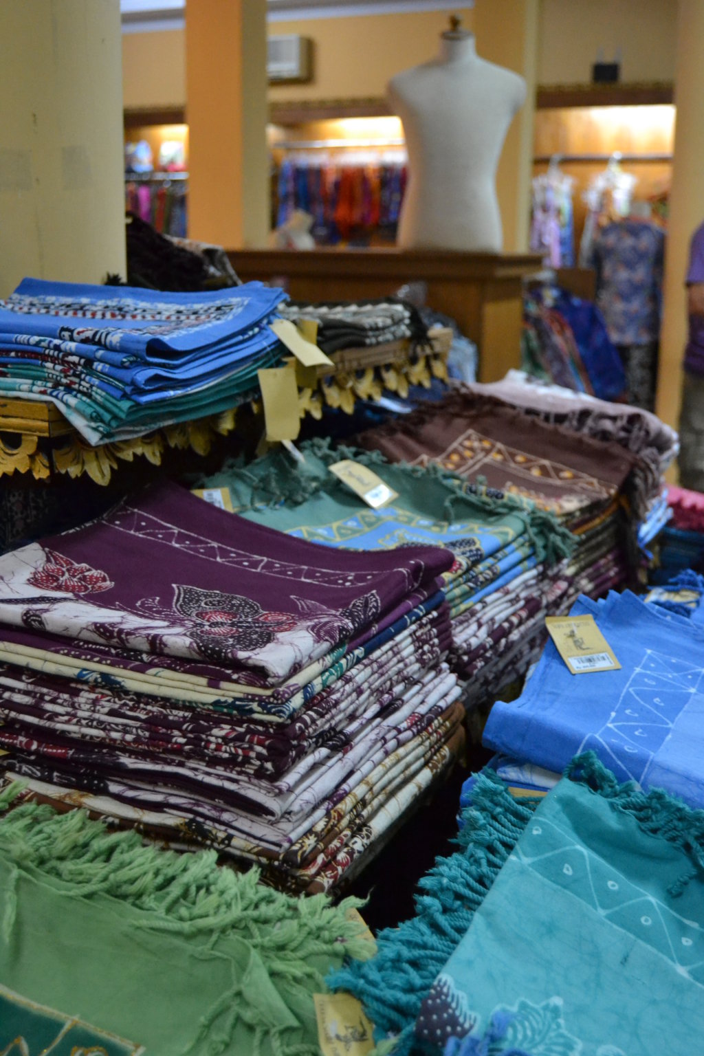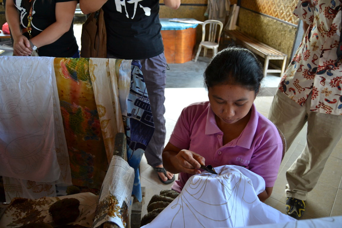 Nächstes Kulturerlebnis war die Sari Amerta Batik Kollektion. Batiken kommt aus Indonesien und ist anders als das in Deutschland. Zuerst wird das Design auf einen weißen Stoff aufgetragen, dann werden die beiden Seiten des Stoffes mit Wachs abgedeckt, dieser wird in Farbe eingetaucht, das Wachs an manchen Stellen mit einem Messer abgekratzt, das Wachs in heißem Wasser herausgewaschen und der Stoff getrocknet. Jeder Schritt wurde live gezeigt. In der großen Ausstellung sahen wir viele schöne Kunstwerke, u.a. Tücher, Bilder und vieles mehr.