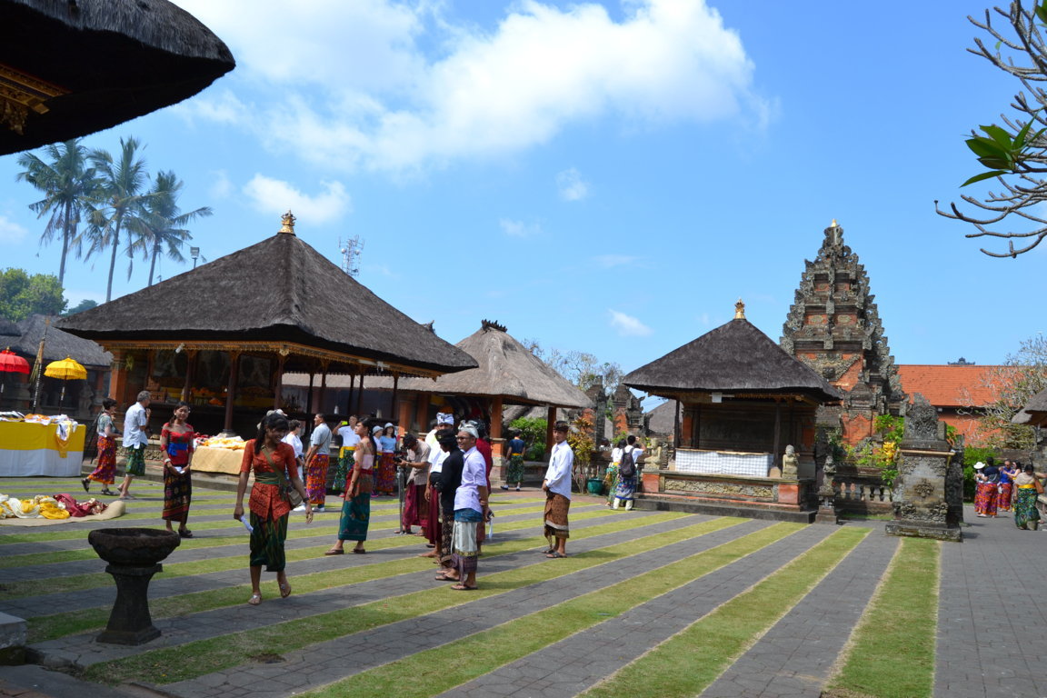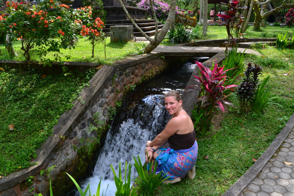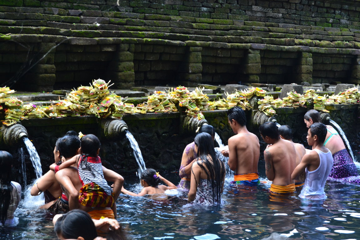 Zum Glück sind wir trotzdem im Tirta Tempel in Tampaksiring angekommen. Schade nur, dass man echt überall Eintritt zahlen muss und die Touristen so abgezockt werden. Das gibts z.B. in Laos und Thailand nicht so. Dafür hat es sich gelohnt und alles ist unter freiem Himmel, die Anlage ist gepflegt, die Villa des Premierministers steht am Hang und wir konnten einigen Hindus bei einer Bet-Zeremonie zuschauen. Wie in allen Tempeln muss man einen Sarong (Tuch) tragen, welcher die Knie bedeckt. Frauen müssen einen Zopf haben und dürfen nicht rein, wenn sie ihre Tage haben. Das Highlight hier war ein großer Brunnen, an dem viele Leute gebetet haben. Diese gehen von Fontäne zu Fontäne, stehen darunter und vollführen ein Ritual. Das soll das Böse abwaschen und Glück bringen. Es war interessant zu sehen, wie die Hindus durch das eiskalte Wasser waten. Auch viele Kinder waren dabei.