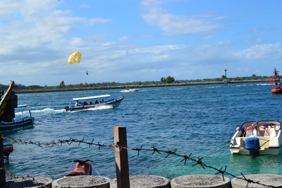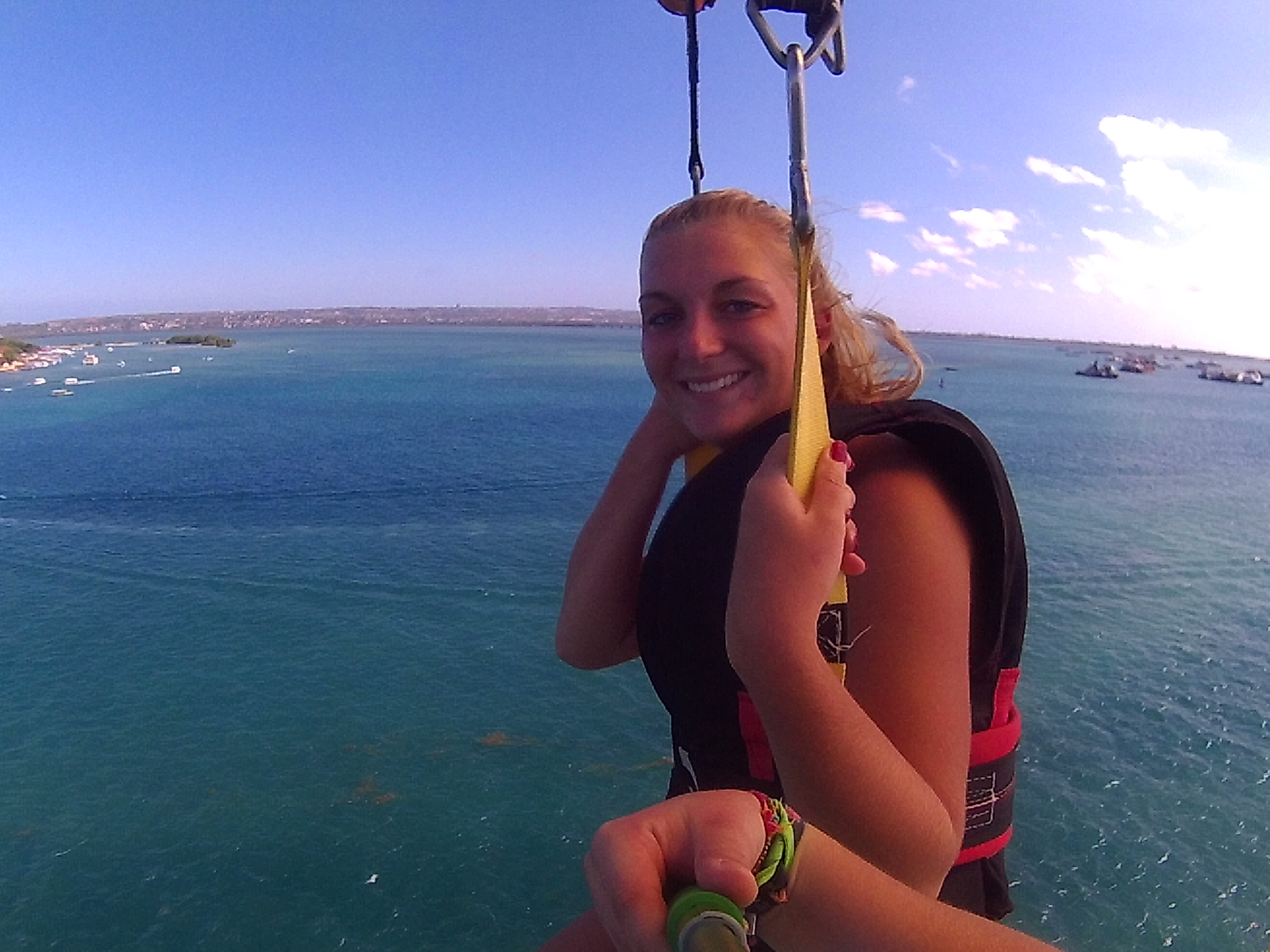 Der 2. Anlauf beim nächsten Anbieter war dann gut. Wir sind mittlerweile gute Verhandlungsprofis und haben den Mann auf über die Hälfte runter gehandelt. Mit 5 Männern und einem Boot ging es auf die schöne See raus. Dort sah es total traumhaft aus und es hatte sehr viele andere Wassersportler. Ein bisschen aufgeregt waren wir schon, als wir die Schwimmwesten und den Gurt angezogen bekamen. Wegen dem starken Wind fiel es den vielen Männern nicht gerade leicht, den Fallschirm zu bändigen. Wir mussten uns hinsetzten und ehe wir uns versahen, waren wir schon in der Luft. Ohne Adrenalinkick und ganz unspektakulär stiegen wir mit Hilfe einer Seilwinde langsam auf. Die Aussicht war absolut genial. Man sah den Hafen, strahlend blauen Himmel, viele Boote und Wassersportler. Die ganze Zeit mussten wir lachen und hatten Spaß wie kleine Kinder. Die 30 Euro für 8 min. waren gut investiert und wir waren froh es gemacht zu haben. Definitiv ein unvergessliches Erlebnis Bali bei Traumwetter von oben zu sehen.