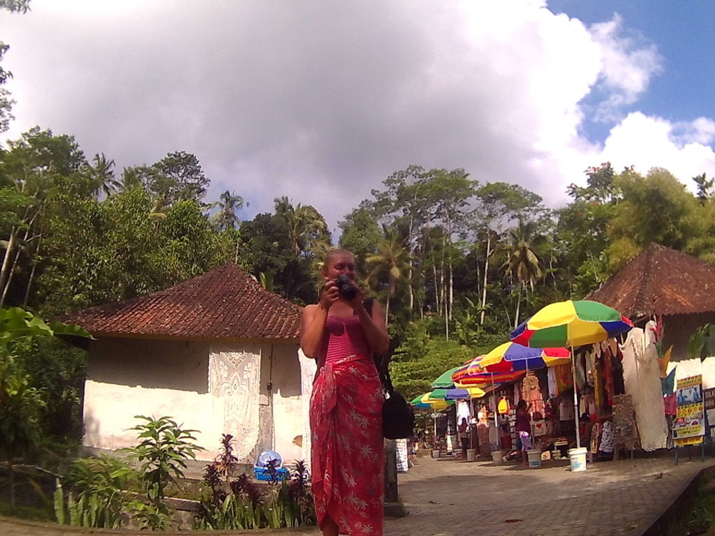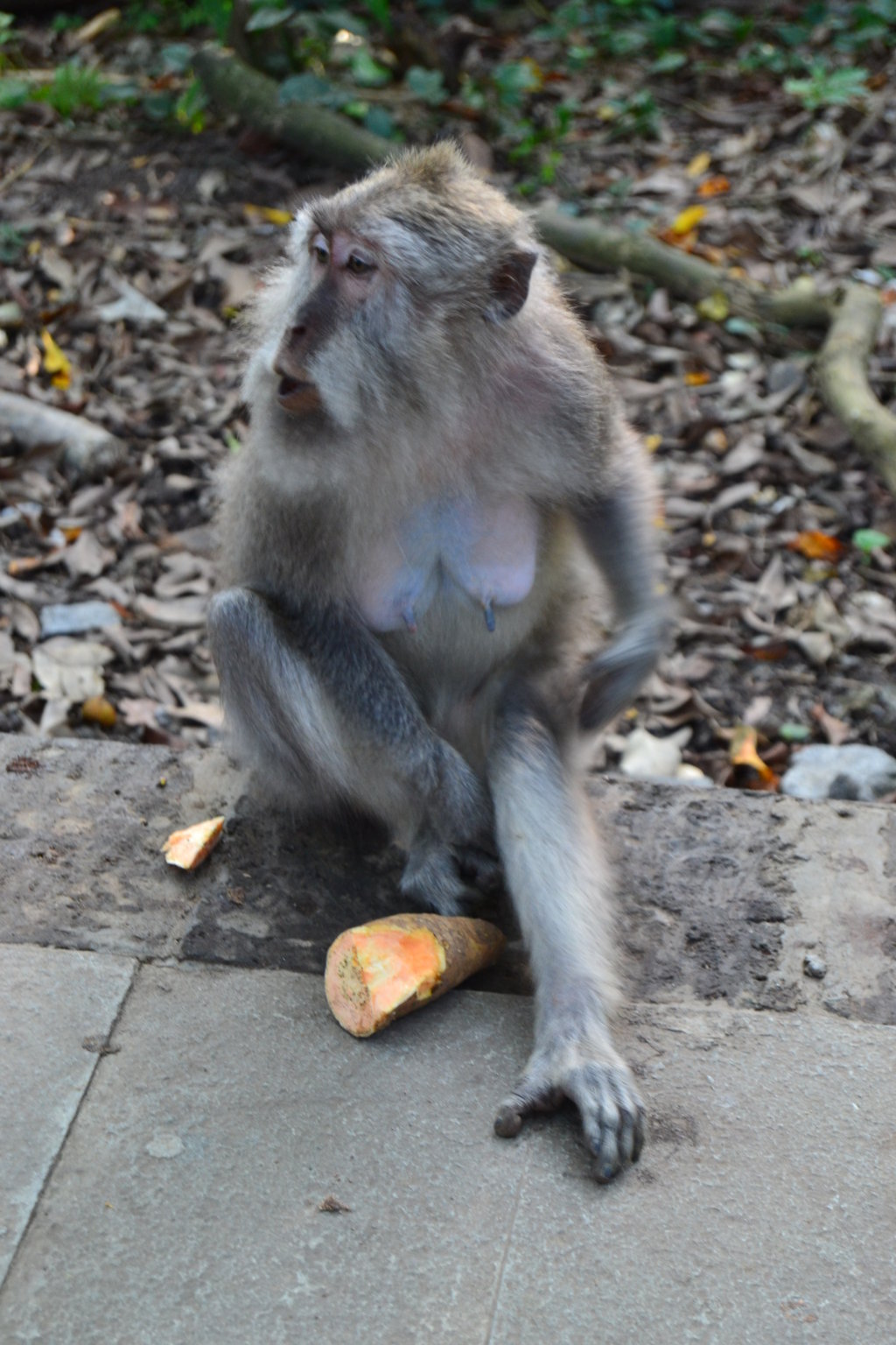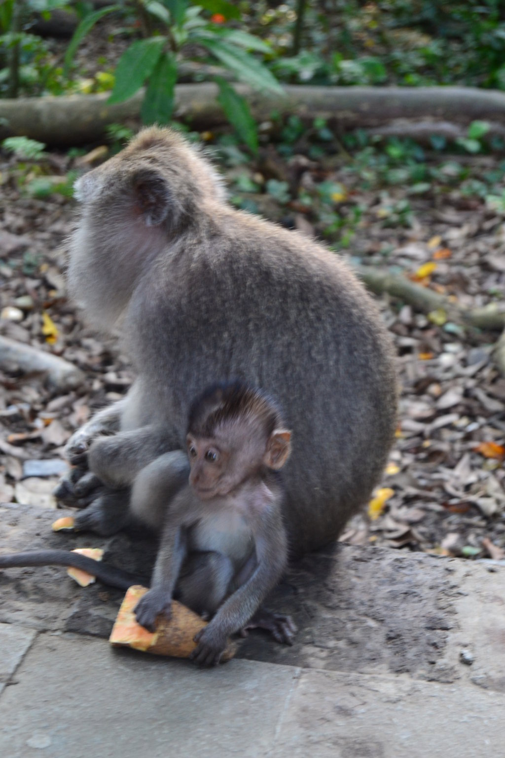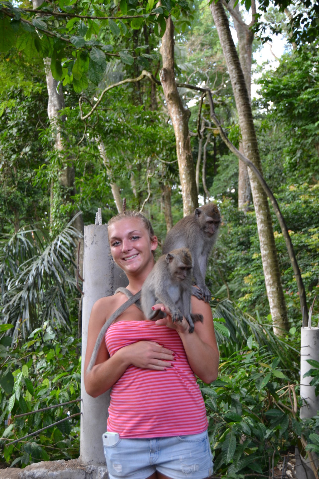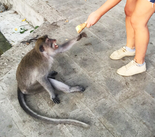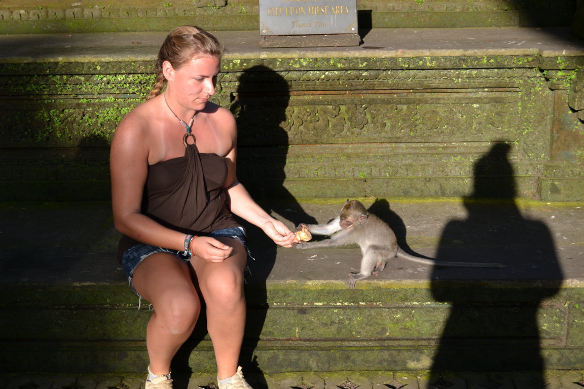 Im Sacred Monkey Forest Ubud (Affenwald), freuten wir uns darauf die freilebenden Affen zu füttern. Wir wollten keine Bananen kaufen aber fanden eine Art Zuckerrübe auf dem Boden. Ich wusste man soll keinem Affen in die Augen schauen und diese nicht provozieren. Ich weiß nicht warum, aber wahrscheinlich hielt ich die Rübe einen Moment zu lange fest und dann war es für den Affen vorbei. Zuerst fletsche er nur die Zähne, dann machte er wütende Geräusche und umso mehr ich zurück wich, desto aggressiver wurde er. Ich wollte nicht wegrennen, weil ich wusste er würde folgen. Saskia rief mir nur zu ich solle ruhig bleiben und keine Panik haben. Ich guckte einfach in die Luft und versuchte mir meine Panik nicht anmerken zu lassen. Irgendwann verschwand der Affe zum Glück und ließ mich mit nassen Händen und viel Herzklopfen zurück. Auch Saskia hatte Panik und die vielen Leute die sich während dem „Schauspiel“ um uns rum versammelt hatten, waren auch erleichtert, dass es vorbei war.