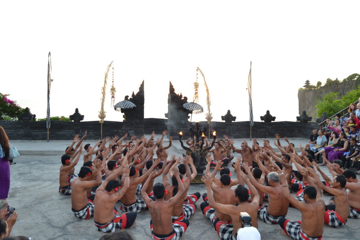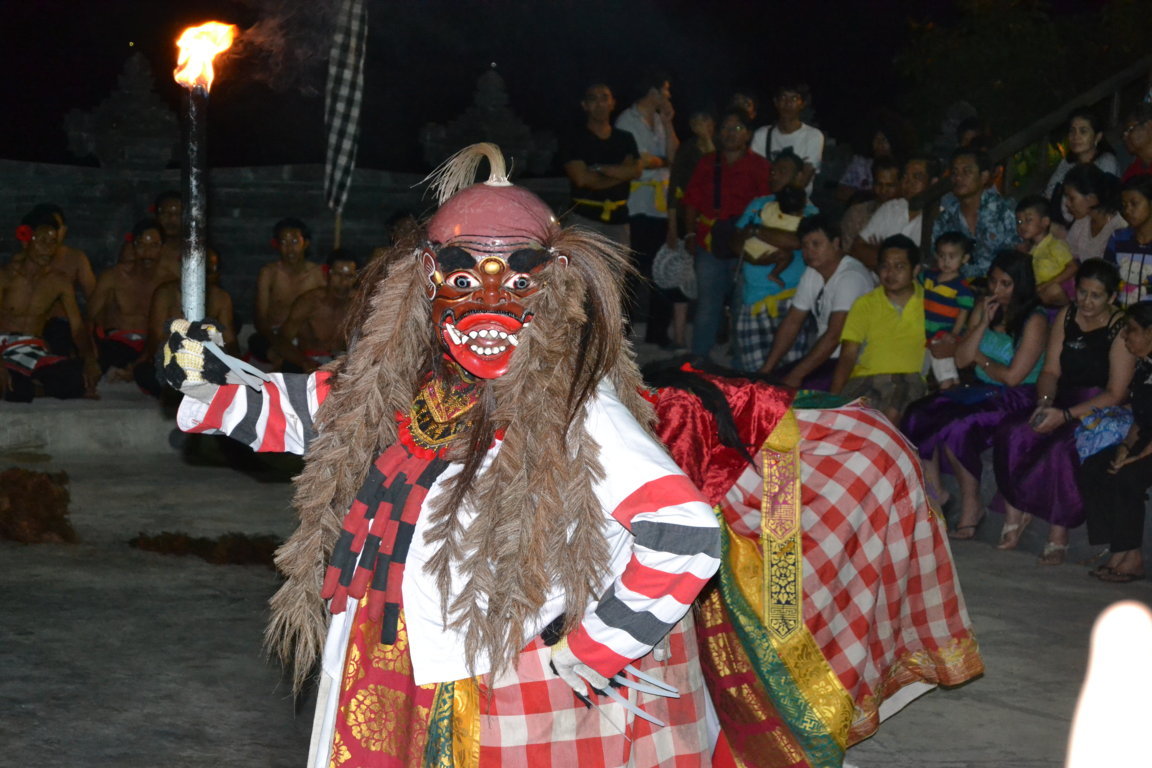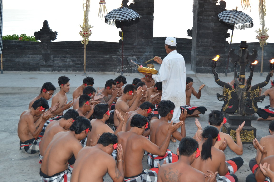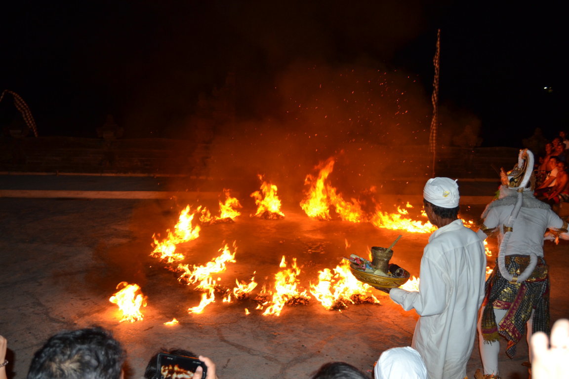Pünktlich um 6 zum Sonnenuntergang begann der Kecak Fire & Trance Dance in einer Art Amphitheater im Tempel. Auch dieser war in 4 Akte geteilt, die man auf einem Zettel mitverfolgen konnte. Zuerst kam ein Chor mit 50 Männern herein, die die ganze Zeit das Selbe sangen, während die Tänzer die Geschichte nachspielten. Als ein weißer Affe kam, rannte er zwischen den Zuschauern rum, wuschelte einem Mann durch die Haare und setzte sich dann zwischen Saskia und mich. Alle Leute machten Bilder und lachten über uns und den Affen. Dieser war sehr akrobatisch und machte sogar Ballett. Die Show ging eine ganze Stunde und als die Sonne gerade ganz hinterm Horizont verschwunden war, wurde im letzten Akt der Affe im Feuer verbrannt und die ganze Bühne stand in Flammen. Zum Glück konnte dieser nicht verbrannt werden und blieb lebendig. Heute haben wir also Sonnenunter-, und aufgang gesehen. Auch dieser traditionelle Tanz, der der Geschichte der Hindus nachempfunden, war super lohnenswert.