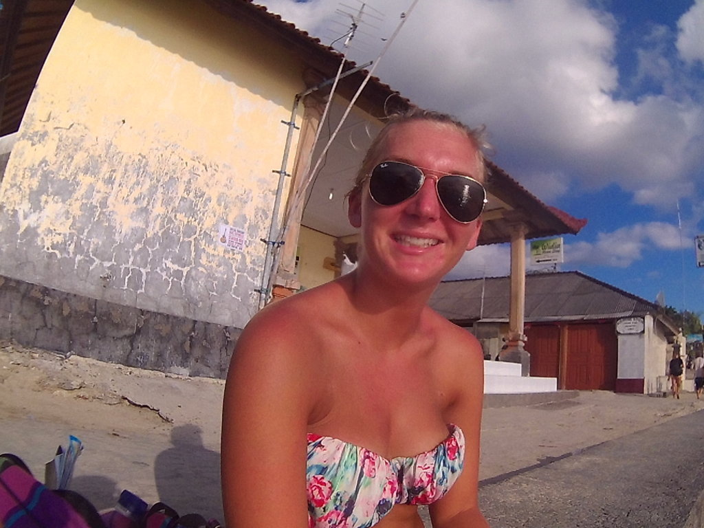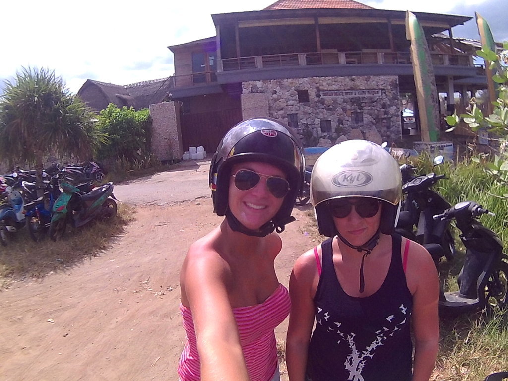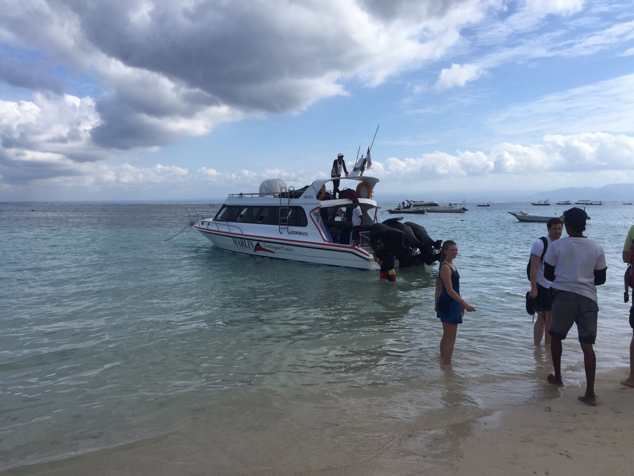Nach einer Weile Fahren, wurden wir irgendwo raus geschmissen und wunderten uns. Der Fahrer begleitete uns zum Office wo wir warten mussten. Nach einer Stunde Wartezeit ging es mit ganz vielen anderen Leuten zu Fuß zum Strand und dann auf ein kleines Fastboat. Bisher habe ich ja schon viele Transportmittel ausprobiert aber ein solches war noch nie dabei. Als es los fuhr, konnte man in die sehr erschrockenen Gesichter (unsere nicht ausgeschlossen) der anderen blicken. Es ist wie in der Achterbahn und macht Schläge bei denen man denkt, das Boot zerbricht gleich in alle Einzelteile. Um Himmels willen, dachten wir und es traf uns alle paar Sekunden ein Adrenalinstoß im Bauch. Das Boot ist förmlich geflogen und immer wieder stark auf den Wellen aufgekommen. Ganz geheuer war das glaub ich niemandem und wir waren froh, dass es nach einer halben Stunde vorbei war, wir die Insel Nusa Lembongan erreichten und niemandem schlecht wurde.
