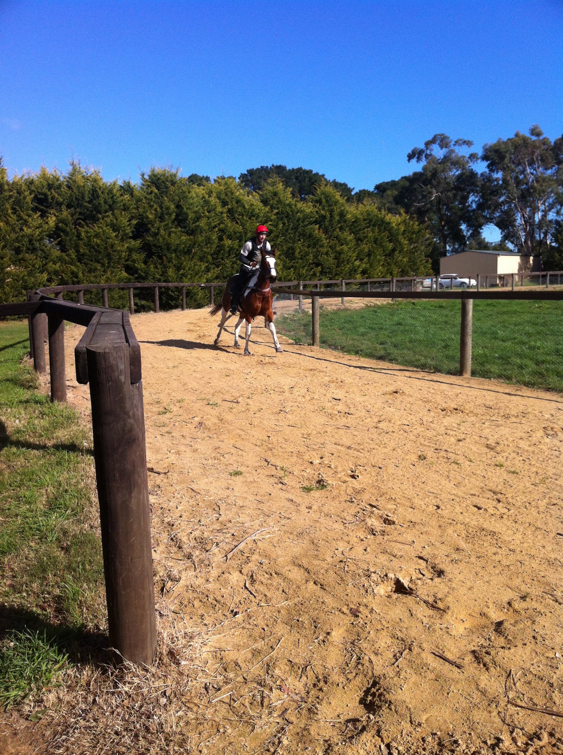Das Highlight war als John kam. Er ist Trackrider und reitet auch Pferde ein. Kate (Tochter von David und Schwester von Tom) hat eine 4 jährige Stute, aber kann zur Zeit nicht reiten. Sie ist ein Warmblut, Pinto und ein Springpferd, hat also nichts mit Rennpferd zu tun. Kate organisierte, dass John die Stute 2 mal reitet, bevor ich drauf sitze, weil sie schon fast 4 Monate nicht mehr geritten wird. Sie steht zusammen mit der Stute von Davids Frau Tag und Nacht auf einer Koppel an dessen Haus. Kathrin half uns „Gipsy“ zu holen und fertig zu machen. Erst ließ John sie im Roundpen laufen, dann saß er dort auf sie drauf und als das gut klappte, ging er auf den Track. Dieser ist eine ovale Rennbahn auf der Farm aus Sand und 1km lang. John ritt Gipsy im Schritt, dann im Trab und dann galoppierte er sie langsam. Sie war von Anfang an total lieb und hat alles super gemacht. Das ist für ein junges Pferd das so lang steht nicht selbstverständlich. Am Freitag wurde es ernster. John kam nochmal und ging gleich auf den Track mit ihr, dann ritt er eine Runde auf dem Reitplatz und dann kam mein Part. Ich freute mich total Gipsy zu reiten und sie war toll. Total gelassen und es war super. John war sehr zufrieden und machte viele Bilder und Videos. Unsere Managerin Sheryl fuhr mit dem Auto vorbei, hielt an und stieg nach einer Weile aus. Lange redete sie mit John, aber ich war so konzentriert, dass ich nicht zuhörte. Nach dem Reiten sagte sie, dass ich das so gut gemacht hätte, dass sie sich vorstellten könnte, dass ich einige der Rennpferde reiten kann. Das war natürlich eine große Ehre und wäre sau cool, wenn das klappen würde.