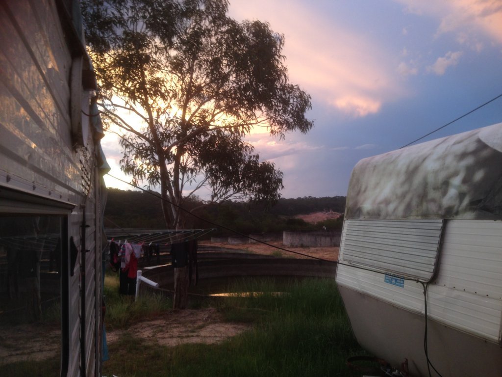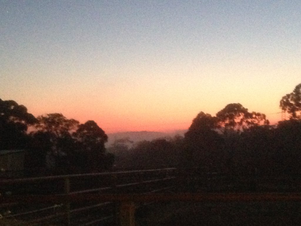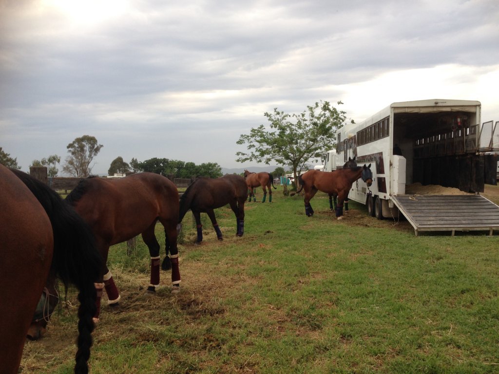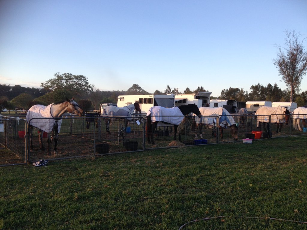 Freitags um 4 Uhr morgens klingelte der Wecker und um 5 standen wir vor dem ersten Paddock. Die Pferde schliefen noch und da es kein Licht gibt, mussten wir sie in den großen Paddocks mit der Taschenlampe suchen. Alle 9 Vierbeiner wurden nacheinander von uns „eingesammelt“ und zum Anbindeplatz gebracht. Morgens kommen alle Decken runter, die Halfter werden gegen pinke Knotenhalfter ausgetauscht und dann werden alle Sportler in den großen LKW verladen. Dort gehen sie von allein rein. Es ging gerade schon langsam die Sonne auf, als wir die Farm verließen. Aylin blieb da um sich um die restlichen Pferde zu kümmern. Wir hatten ein Pony von Kunden dabei und dessen Sattelzeug war in deren Anhänger. So musste ich diesen mit dem Ute (Auto) ins 1 Stunden entfernte Richmond ziehen. Das war schon das erste Hindernis. Ich bin seit Ewigkeiten kein Schaltauto gefahren, dann muss man noch mit der linken Hand schalten und der Hänger ist so groß, dass man in Deutschland dafür bestimmt einen Lastwagen-Führerschein bräuchte. In Australien muss man keinen Hängerführerschein machen. Die Straßen sind sehr schmal und kurvig und obwohl mein Chef gesagt hat er fährt langsam (er fuhr ja den großen LKW) war er ziemlich zügig unterwegs. Ich fand nie den dummen 3. und 4. Gang und man musste in den Serpentinen total oft schalten. Das Auto muss man außerdem sehr hoch drehen lassen, dass er den schweren Hänger ziehen kann. Wenigstens war eine PINK!-CD drin und da ich totaler PINK!-Fan bin, konnte ich jedes Lied lauthals mitgrölen und meine Laune wurde aufgehellt.