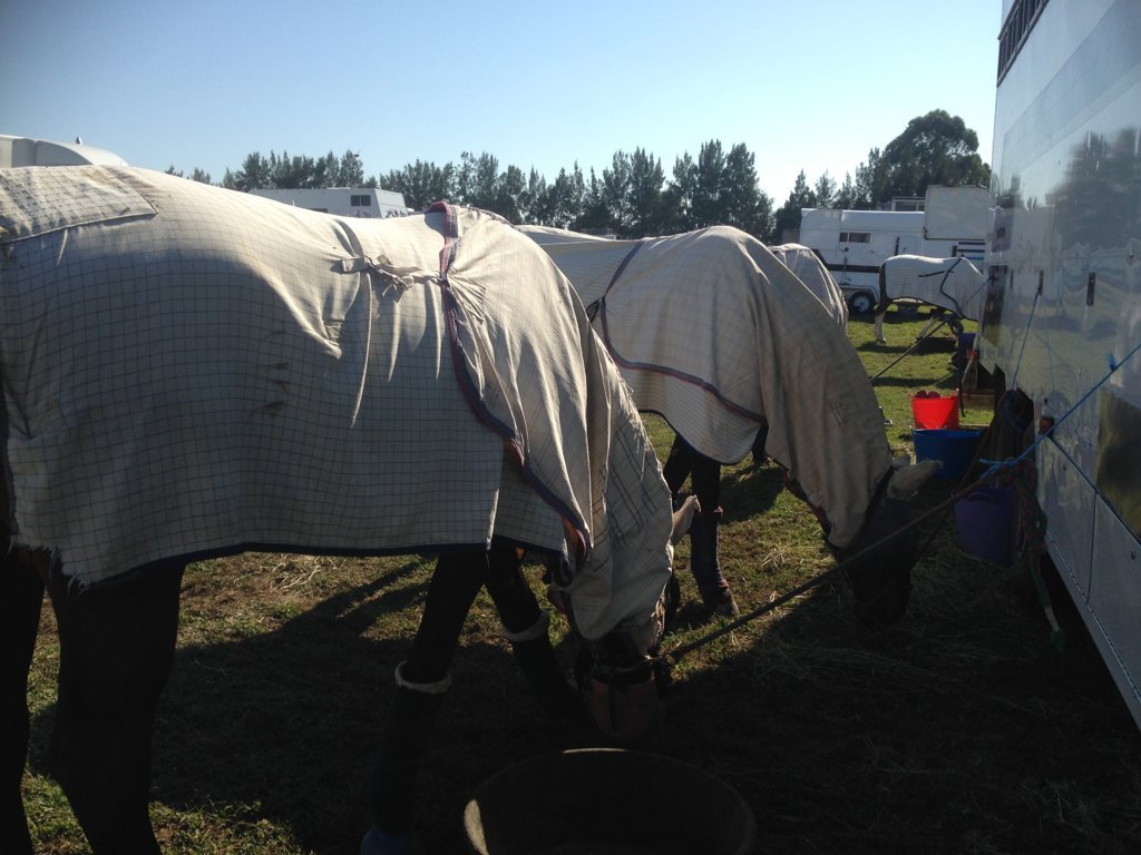 Erst wurden alle Vierbeiner an Strohschnüren am LKW festgebunden, dann gabs Wasser, Heu und Futter für alle. Wie beim letzten Mal auch schon, waren die Sportler alle sehr entspannt und ich glaube für die ist das Turnier was schönes. Es herrschten schon morgens schweißtreibende Temperaturen und das Wasser schleppen fiel mir sehr schwer. Den Pferden hängte ich ab und zu nasse Handtücher in den Nacken um sie ein wenig abzukühlen.