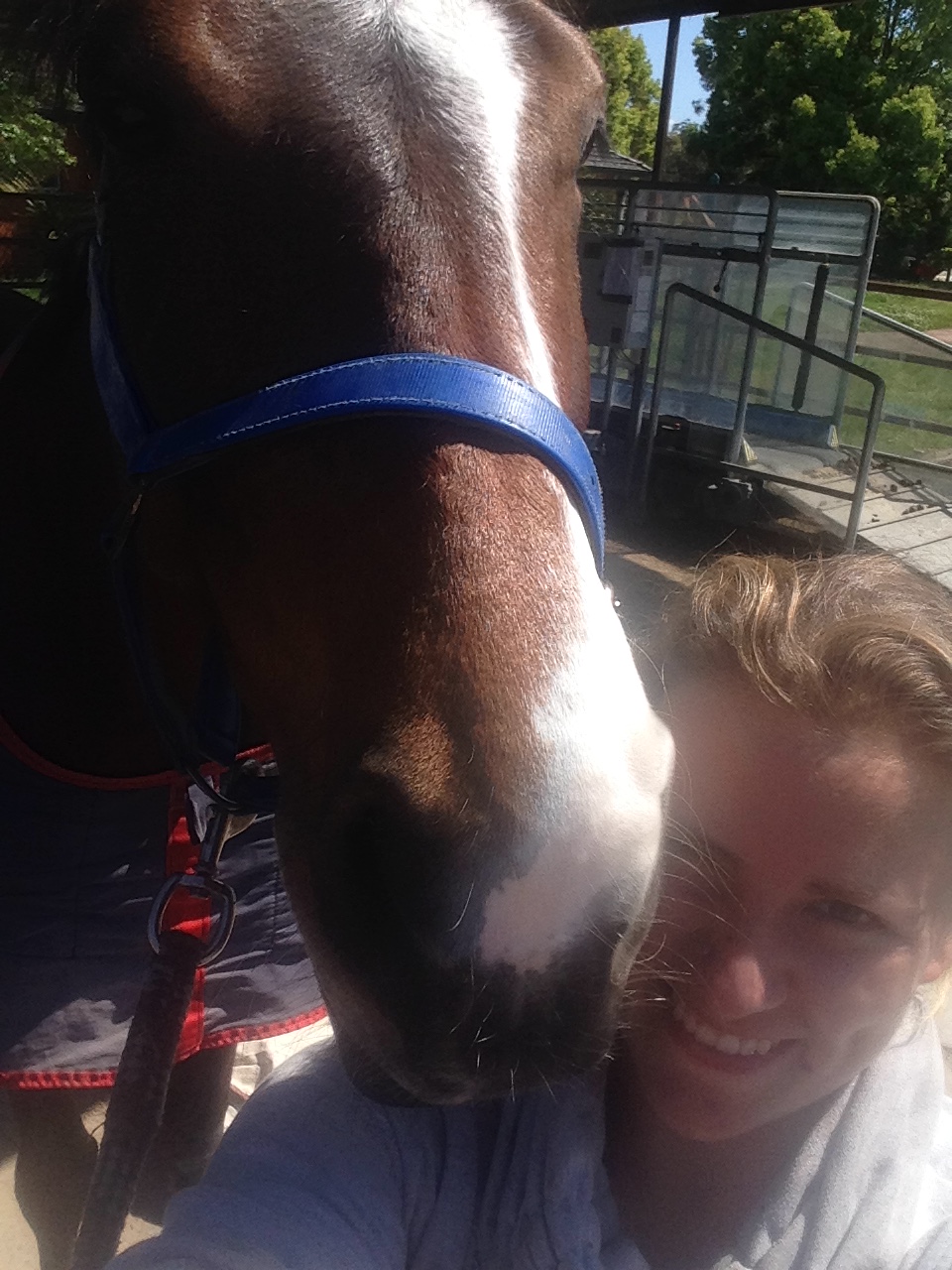 Ein Pferd steht hier seit einigen Wochen, damit Jenny testen kann, ob es lieb genug für seine neue Besitzerin ist. Diese hatte den Fuchs noch nie gesehen und Jenny wollte ihr Bilder schicken. Erst ritt sie und sprang ihn ein bisschen. Dann sollte ich drauf sitzen. Ich dachte sie will nur Standbilder machen, aber dann sollte ich antraben, angaloppieren und schließlich über ein Kreuz springen. Aus diesem wurde dann ein ganzer Parcours und der Wallach ist ein Traum. Obwohl ich schon ewig nicht mehr richtig gesprungen bin, hatte ich sehr viel Vertrauen zu ihm und er machte alles perfekt. Das war das erste Mal, dass ich ihn geritten bin und die Hindernisse waren ca. A-Höhe. Jenny bekam gute Bilder und ich war glücklich, dass ich ihn reiten durfte.