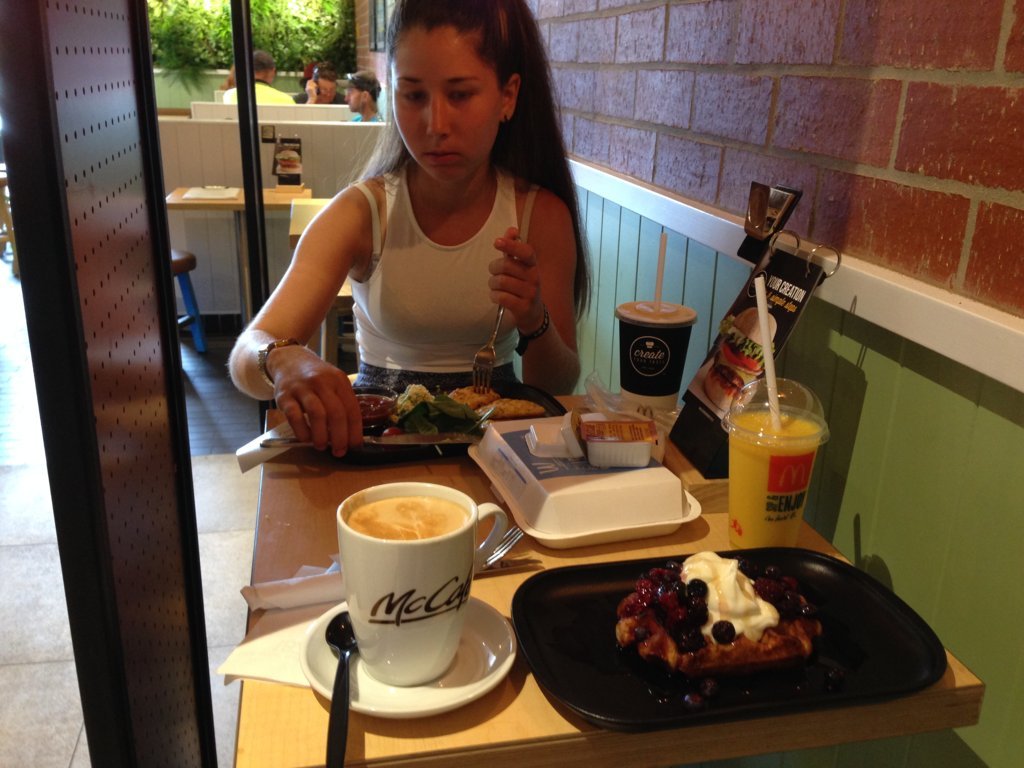 Da es in Coffs Harbour nichts zu unternehmen gibt, setzen wir uns zum langen Frühstück in den MC Donalds. Dieser hat eine große Auswahl an leckeren Dingen. So aß ich eine belgische Waffel mit Beeren, Vanillesoße und Joghurt, ein vegetarisches Frühstück mit Rührei und Aylin gönnte sich Waffeln und ebenfalls ein gutes vegetarisches Frühstück.