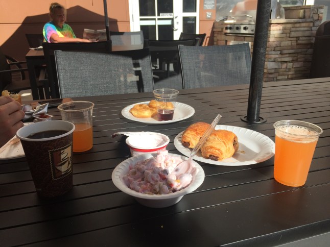 Davor hauten wir uns aber ordentlich die Bäuche beim reichlichen Buffet voll. Dieses war einfach abartig und es gab alles was das Herz begehrt; von selbstgemachten Waffeln, Schokocroissants, über Brötchen, zu verschiedenen Eiern, Obst und vielem mehr. Danach konnte man uns quasi rollen. Trotz Luxushotel aber auch hier alles in Plastikbechern und mit Plastikgeschirr.
