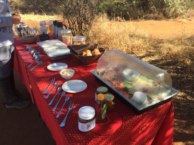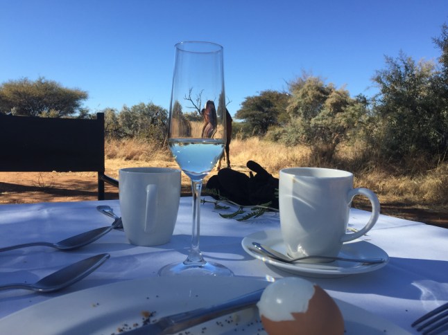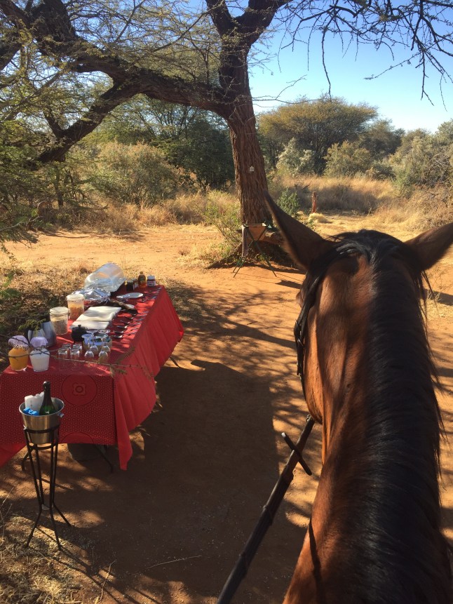 Und als ob das noch nicht genug für den ersten Ritt wäre, hielten wir nach zweieinhalb Stunden an einem schönen Platz unter einem Baum, wo bereits alles aufgebaut war. Ich hatte nämlich das Glück und durfte bei einem Buschfrühstück dabei sein. Es gab alles was das Herz begehrt, von Müsli, bis Obst, Brot und Eiern bis hin zum Sekt. Die Pferde trensten wir ab und banden sie mit den Halftern an Pfahle, wo sie bereits Heu hatten. So saßen wir gemütlich da und guckten den Pferden beim Fressen zu, wobei wir selbst genüsslich speisten. Ich war wirklich geflashed. Das hatte ich nun nicht erwartet.