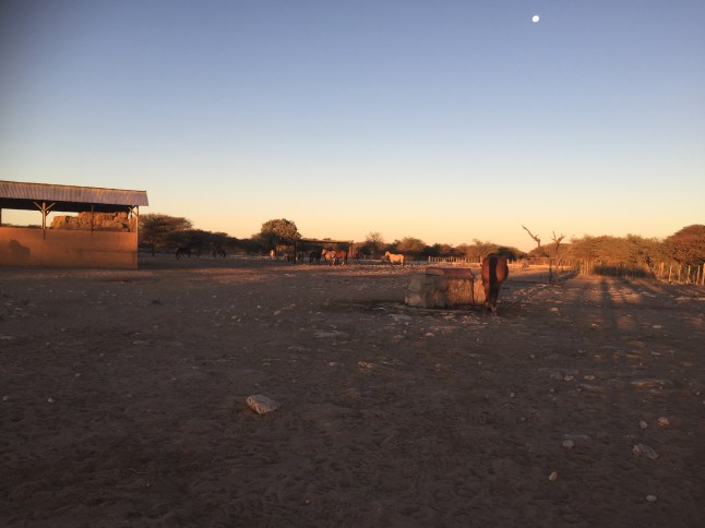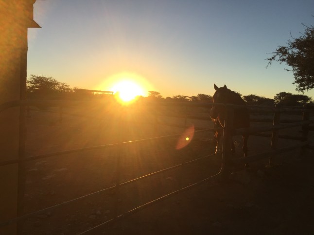 Mein erster Tag in Namibia fing schon früh an. Um 6 Uhr klingelte der Wecker und um halb 7 stand ich in der Dunkelheit vor dem Stall. Nachts und Morgens ist es hier sau kalt und die Temperaturen fallen gerade im Winter auch unter Null Grad. Meine Wärmflasche ist Goldwert und wärmte mich nachts wenigstens ein bisschen auf.