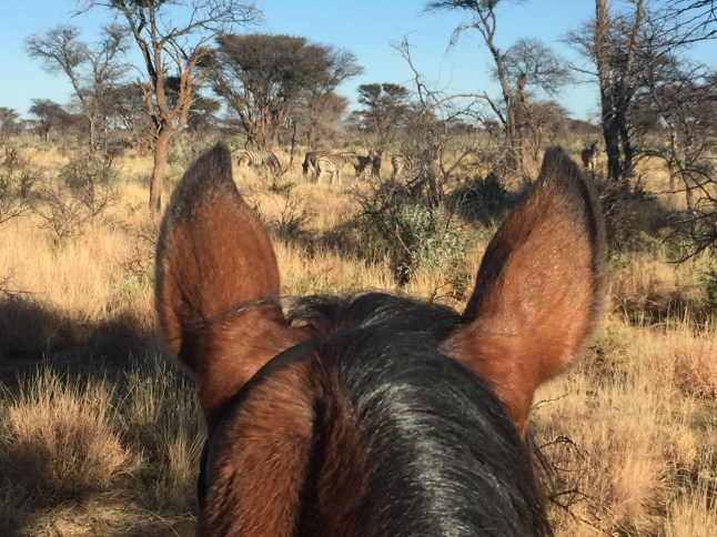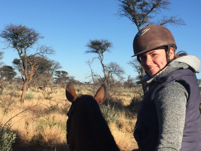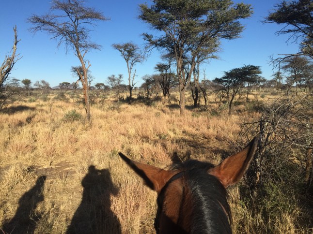 Jedes der Tiere hat seine eigene Putzkiste, Halfter und Trense und diese brachten wir an die Putzplätze. Wenn alle Pferde statt sind, werden die die für den ersten Ritt gebraucht werden, direkt eingefangen. Am Putzplatz putzt und sattelt man alle Pferde und wartet auf die ersten Gäste. Marie, eine Französin die schon seit 2 Jahren hier ist, führte den Ritt an. Außerdem waren noch zwei Mädels aus Frankreich dabei und ich bildete mit der Stute Waldfee das Schlusslicht der Truppe. Schon um 7.30 Uhr ritten wir durch die verdorrte Landschaft. Es fühlte sich einfach unglaublich an auf dem Pferderücken nach Tieren Ausschau zu halten. Es dauerte nicht lange, da deutete Marie in eine Richtung. Impalas (am häufigsten in Afrika verbreitetste Antilopen) rannten direkt neben uns her. Solche Tiere aus der Nähe zu sehen beeindruckte mich schon total. Selbst beim Reiten ist es morgens noch sehr kalt und ich war froh um meine beiden Jacken und meinen Schal. Der erste Galopp fühlte sich total gut an und ich merkte wie sehr ich es vermisst hatte im Sattel zu sitzen. Wir galoppierten eine ganze Weile und konnten unsere Blicke durch die unberührte Natur schweifen lassen. Waldfee machte das ganz brav. Dann hielten wir an und da standen sie direkt vor uns: Zebras. Eine ganze Herde die sich nicht durch uns beirren ließ. Das war so ein wahnsinniger Moment, dass ich es kaum glauben konnte. Die Zebras waren total cool. Es folgten weitere, schöne Galoppeinheiten bis wir plötzlich direkt vor Giraffen standen. Auch diese ließen sich durch uns in keinster Weise beirren und fraßen gemütlich Blätter am Baum. Wir waren so nah an den Tieren wie ich es nie erwartet hätte.