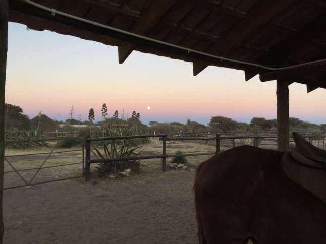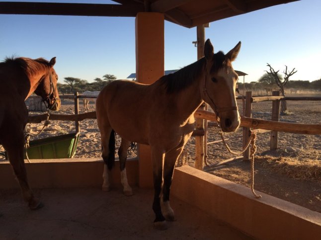 Diesmal durfte ich mit der anderen Guidin Viva mitreiten. Ich bekam die Falbenstute Pewa und wir hatten als Gäste Mutter und Tochter dabei, die schon im Vorjahr hier waren. Das spricht sehr für die Farm, zumal viele Gäste wieder kommen. Wir ritten einen Weg den ich noch nicht kannte und am Anfang war Viva vorne. Dann durfte ich an die Spitze und die Gruppe anführen. Pewa ist super toll zu reiten und machte echt Spaß. Der Weg führte in Schlangenlinien durch den Wald und war super schön. Wie auch die letzten Tage war es morgens noch ziemlich kühl und ich hatte drei Jacken an. Im Schritt und im Trab ritten wir vorbei an vielen Termitenhügeln und Dornenbüschen. Nach eineinhalb Stunden waren wir zurück auf der Farm und ich fütterte wieder Heu und Kraftfutter. Das Heu piekst hier total und ich hatte es später überall. Dann ging es um 11.30 Uhr in die wohl verdiente Mittagspause.