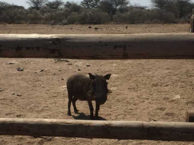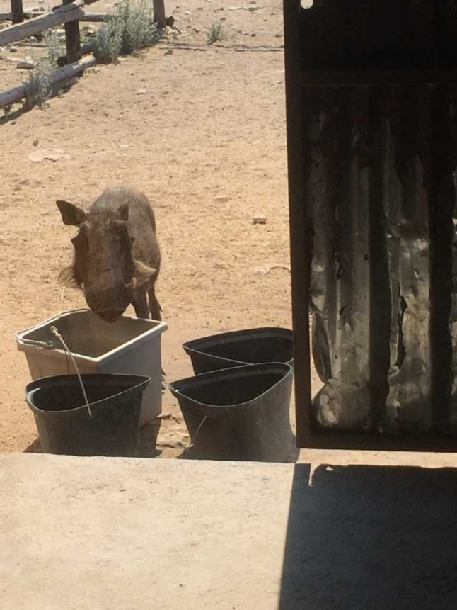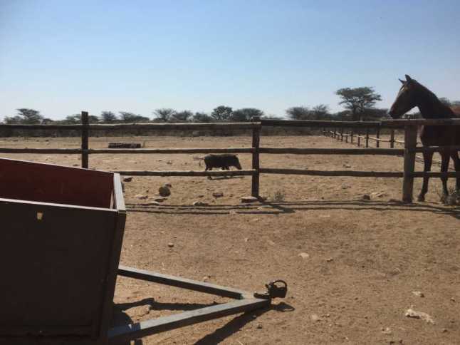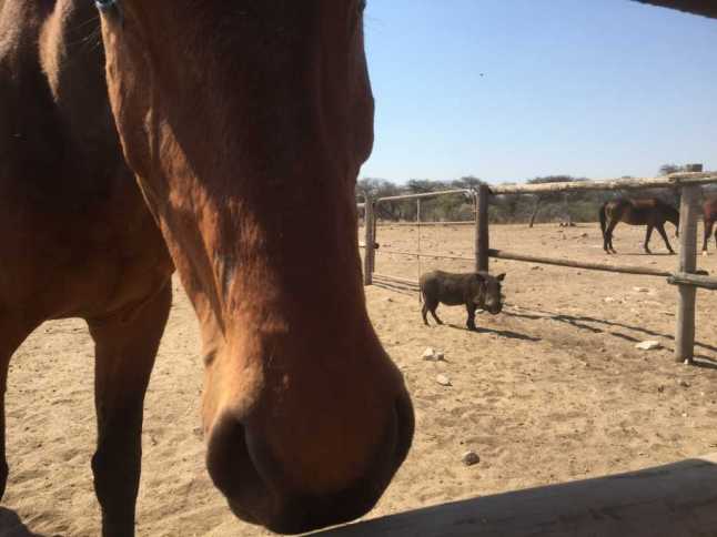 Nachmittags hätte ich eigentlich einen eineinhalb Stunden Ritt gehabt. Da Laura aber den Weg zum Bushcamp nicht wusste, sollten wir tauschen und ich ritt mit Riley und einer Frau zum Camp. Ich wollte gerade die Pferde füttern und machte die Stalltür auf, als plötzlich ein großes Warzenschwein vor mir stand. Im ersten Moment erschrak ich, aber fand es total süß. Es ging da gar nicht weg und guckte mich nur schief an. Mit Futter in der Hand versuchte ich es zu locken und es kam tatsächlich her. Als ich mich umdrehte, marschierte es an den Eimer und fraß wie selbstverständlich dem Pferd sein Futter weg. Auch nachdem das Futter leer war, streunerte das Schweinchen noch zwischen den jungen Pferden auf der Koppel rum. Auch Laura die dann dazu kam, fand das Schwein süß und sie gab ihm dem Namen „Fridolin“. Ich finde das passt sehr gut und nun haben wir ein „Hausschwein“.