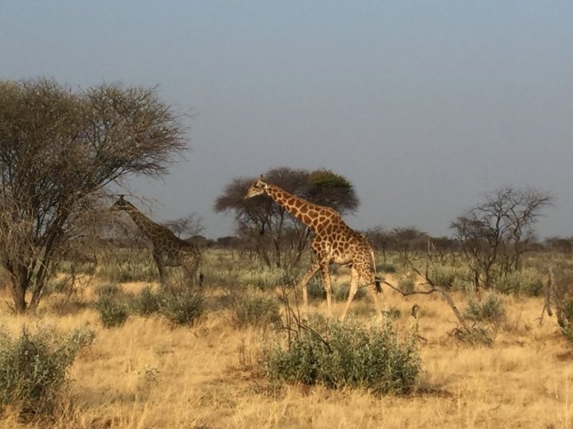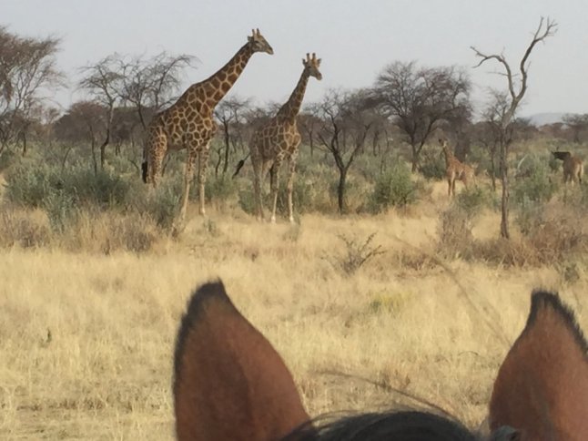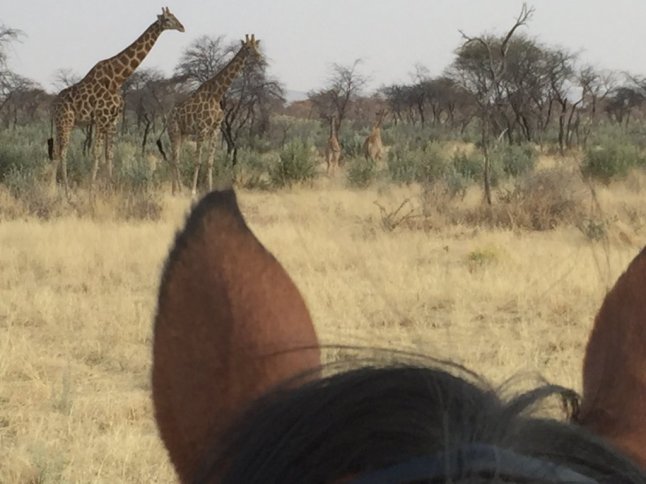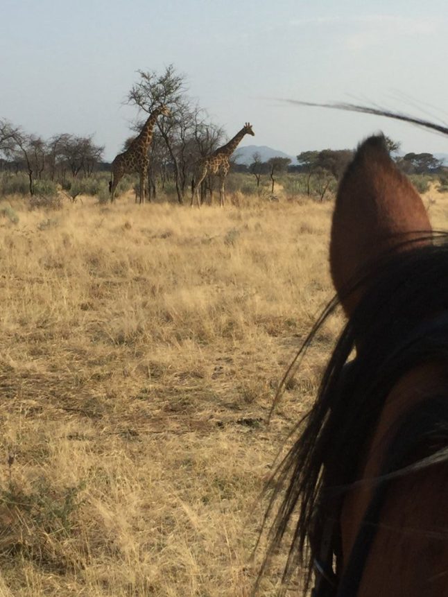 Als wir schon fast zurück waren, sahen wir eine riesige Herde Gnus die ganz nah war. Und plötzlich im Busch trafen wir auf Giraffen. Dabei waren auch zwei Babys die wirklich süß sind. Das war das erste Mal, dass ich Giraffen sah als ich allein geguidet habe. Wir sind zwischen den riesigen Tieren durch geritten und diese ließen sich wie immer nicht stören. So nah bin ich noch nie an Giraffen dran gekommen. Giraffen zum Anfassen vom Pferd aus – ein Traum wird wahr ! Das war total schön.
