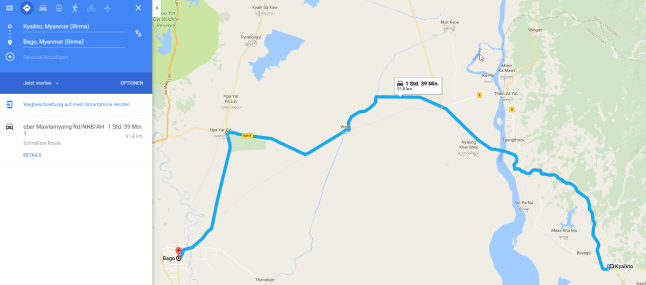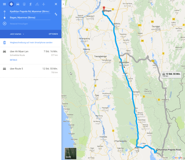 Im Hostel hatten wir noch kurz Zeit uns auszuruhen und dann liefen wir los und suchten ein Taxi. Das fanden wir schnell und es war alt, ohne Klima und zu viert mit Gepäck hatten wir nicht wirklich viel Platz. Trotzdem war es günstig und es war ok. Wir sollten 2 Stunden brauchen, aber waren in einer da. So hatten wir an der Bushaltestelle noch genug Zeit bis der Bus kam und die anderen hatten sich total Stress gemacht. Leider gibt es in Myanmar keine Schlafbusse, aber wenigstens war unser Transportmittel modern, hatte eine Klima und sah nicht aus wie die anderen alten Busse die schon fast kriminell sind. Leider war die Klimaanlage wie immer so kalt, dass man fast erfriert, aber darauf waren wir natürlich gut vorbereitet und hatten lange Klamotten und Schals dabei. Was auch total nervt ist, dass es einen TV gibt und dort total kitschige Myanmar Filme und Musikvideos auf voller Lautstärke laufen. Schlafen konnte ich also nicht gut und im Sitzen schon gar nicht. Es waren fast nur Burmesen im Bus die sich in wahnsinniger Lautstärke unterhielten.