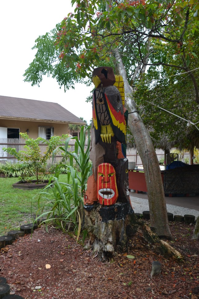 Anschließend besuchten wir den Miccosukee Tribe (http://www.miccosukee.com/indian-village-c/alligator-demonstrations/). Dieser Indianerstamm sind eine der drei von der US-Regierung auf Bundesebene anerkannten Stämme (federally recognized tribes) der amerikanischen Ureinwohner, die in Florida leben. Der Stamm betreibt ein luxuriöses Hotel-Casino und einen Golf-Club in Miami und unterhält eine eigene Polizei. Das Miccosukee Indian Village wurde 1983 gegründet und zeigt eine Anzahl künstlerischer Arbeiten, wie Gemälde, Handarbeiten und Patchwork der Frauen, Kostümpuppen aus Palmfasern und alte Fotografien. Außerdem werden Gebrauchsgegenstände aus dem Leben in den Sümpfen gezeigt.