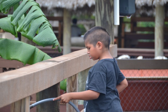 Der kleine Junge spritzte mit dem Gartenschlauch einige Alligatoren ab, denen das sichtlich zu gefallen schien.