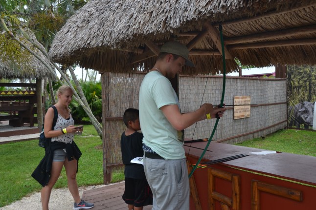 Anschließend hatten wir weiterhin Zeit die Heimat des Stamms zu erkunden. Ein kleiner Junge zeigte uns, wie man mit Pfeil und Bogen schießt und wo bei mir der Pfeil Anfangs noch ständig zu Boden fiel, traf ich am Ende auf eine Zielscheibe und ein Plastik-Reh (zum Glück bin ich Vegetarier). Auch Vroni und Berni waren gut und wir wollten gar nicht aufhören.