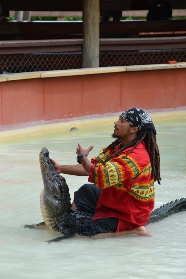 Ein weiterer Punkt unserer Touri-Tour war das „Alligator Wrestling“ das in diesem Dorf statt fand. Ich wollte nicht hin, weil ich dachte, dass das abläuft wie Hahnenkämpfe. Zum Glück stellte sich heraus, dass es eine Art „Krokodilflüsterei“ der Mikasuki ist. Wir waren total beeindruckt, wie ein Stammmitglied irgendeinen Alligator anlockte und lebensgefährliche „Kunststücke“ zeigte. Ohne Gewalt und ohne fesseln, o.ä. hob er den Kopf des Alligators nur mit seinem Kinn fest, steckte seine Hand ins offene Maul und saß dabei auf dem Rücken des Tieres. Wir hatten jede Sekunde Angst, dass der Alligator zubeißen würde. Das war wirklich sehr beeindruckend und man merkt, wie gut die Mikasuki diese gefährlichen Tiere kennen.
