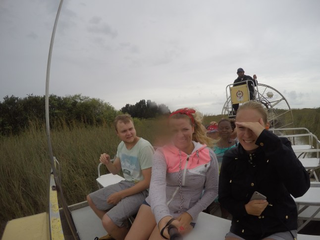 Wir hatten eine Airboat Tour gebucht und es ging auch direkt los. Mit dem Sumpfboot (ein propellergetriebenes Wasserfahrzeug) schossen wir in einer Affengeschwindigkeit durch die Sumpfgebiete der Everglades. Wir fühlten uns wie in der Achterbahn und drifteten um die Kurven, wo das Wasser ordentlich spritzte. Leider nicht nur das Wasser von unten. Es regnete immer noch in Strömen und das Wasser fühlte sich auf der Haut an wie tausende Nadelstiche. Wir sahen überhaupt nichts und mussten unsere Sonnenbrillen aufziehen, sodass das Wasser nicht so weh tat. Es war total unangenehm und ich hoffte, dass die Fahrt nicht so lange gehen würde. Auf einmal bremste der Fahrer stark und wir wussten gleich warum. Ein riesiges Kroko schwamm im Schilf herum. Das war sehr beeindruckend und das Tier ließ sich nicht stören. Das Boot flog übers Wasser und durch den Sumpfgebiete. Mein Zeitgefühl war nicht vorhanden, aber mir kam die Fahrt nicht lange vor.