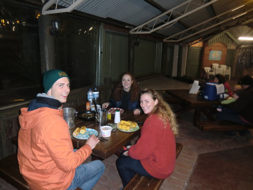 Ein ganz nettes, älteres Ehepaar setzte sich eine Weile zu uns und die beiden redeten lange mit uns. Sie schenkten uns eine große Packung Vanilleeis und Gefriergemüse. Vor einem warmen Feuer in der Mitte vom Aufenthaltsraum, genossen wir unser Eis, hörten Musik, tranken Goontee (Tee mit Billigwein = Eigenkreation) und ließen den wunderschönen ersten Tag unseres Roadtrips gemütlich ausklingen. So hab ich mir das vorgestellt und die Verärgerung über die Strafe war längst verflogen. Ich freute mich einfach nur hier sein zu dürfen und so gigantische Erfahrungen machen zu können.