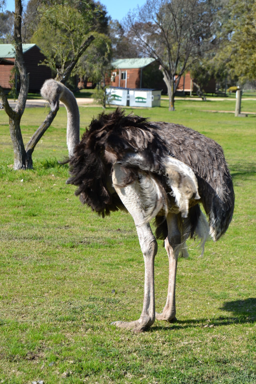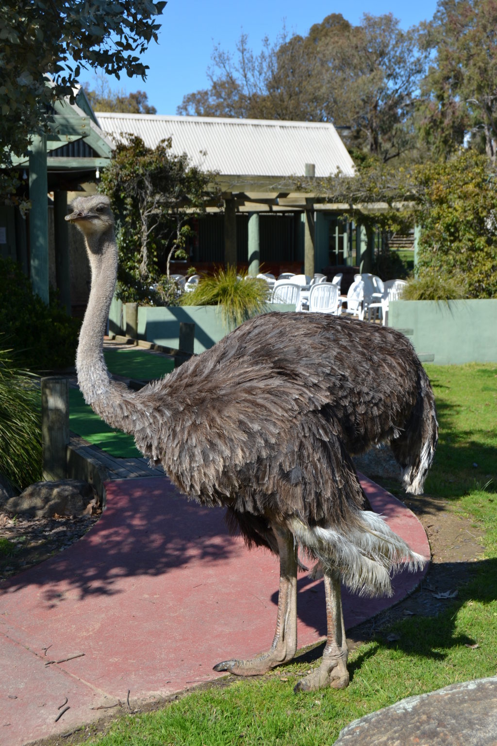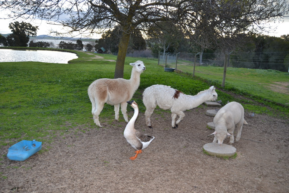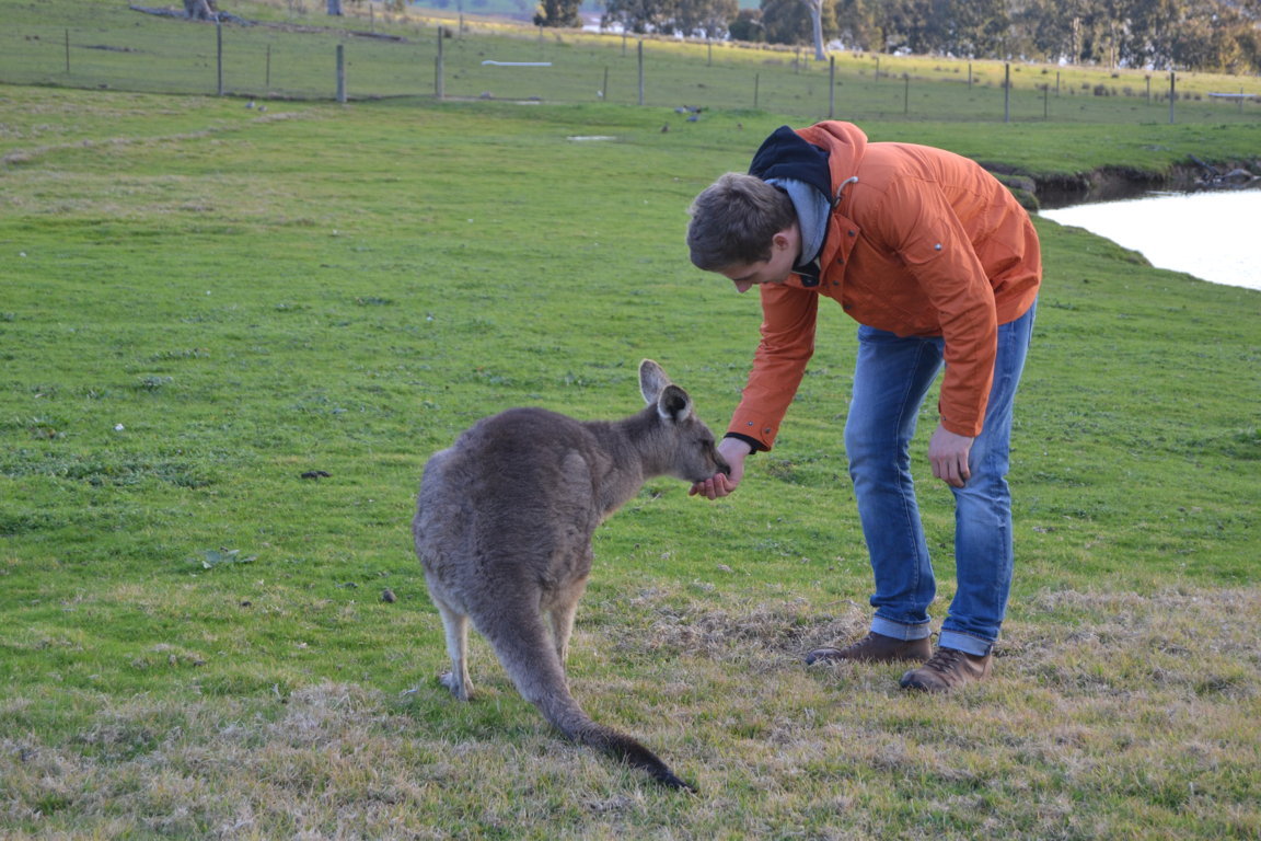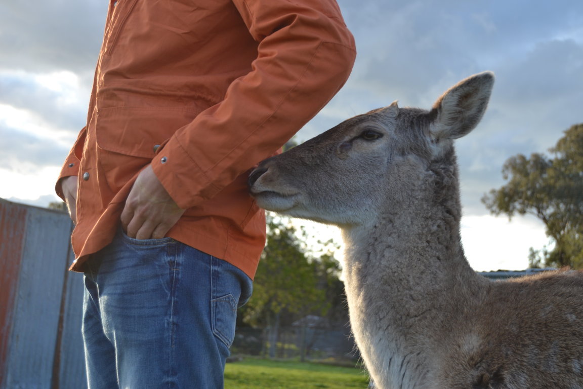 Als Brissie komplett ausgeräumt, das Essen im Kühlschrank verstaut und das Zelt aufgebaut war, kam das Tageshighlight. Wir durften mit dem Ranger die Tiere füttern gehen. Neben Gänsen, Llamas, Schafen und Rehen, fraß uns auch ein Känguru aus der Hand. Jona konnte somit den Punk „Känguru sehen“ auf seiner Bucketlist abhaken und wir waren alle sehr beeindruckt und hatten viel Spaß mit den Tieren. Der Campingplatzbesitzer nimmt kranke und verletzte Tiere auf und peppelt sie auf. Auf dem Campingplatz läuft ein Strauß rum, der uns ständig verfolgte und uns nicht ganz geheuer war.