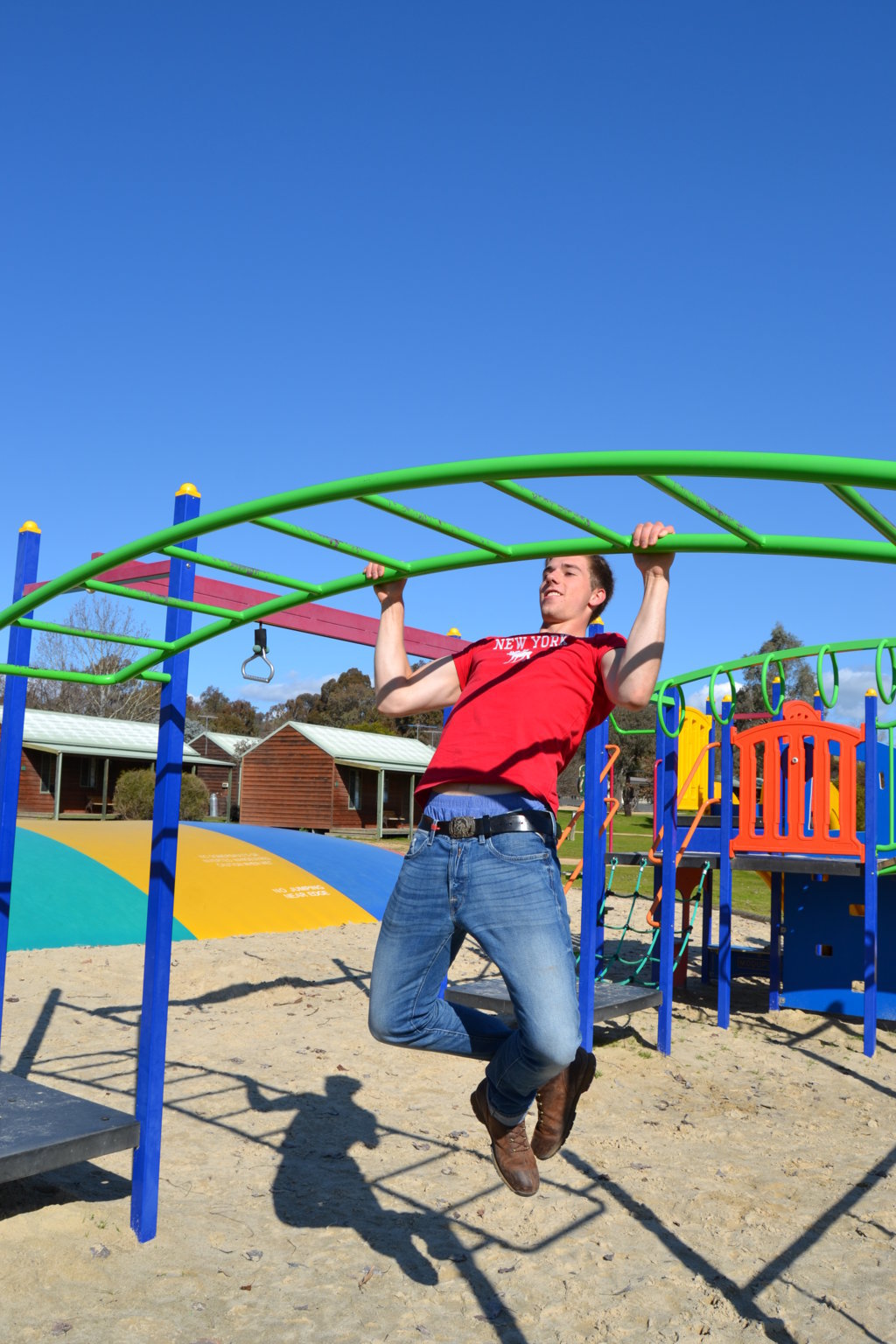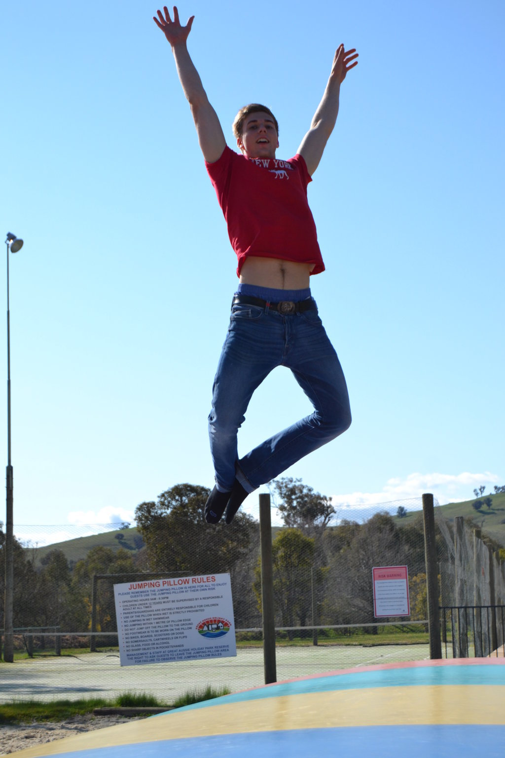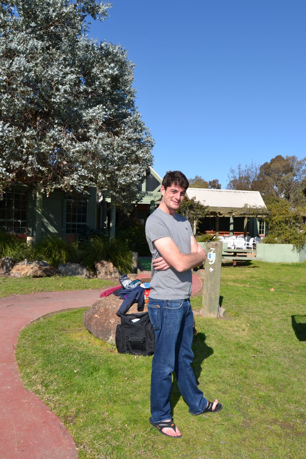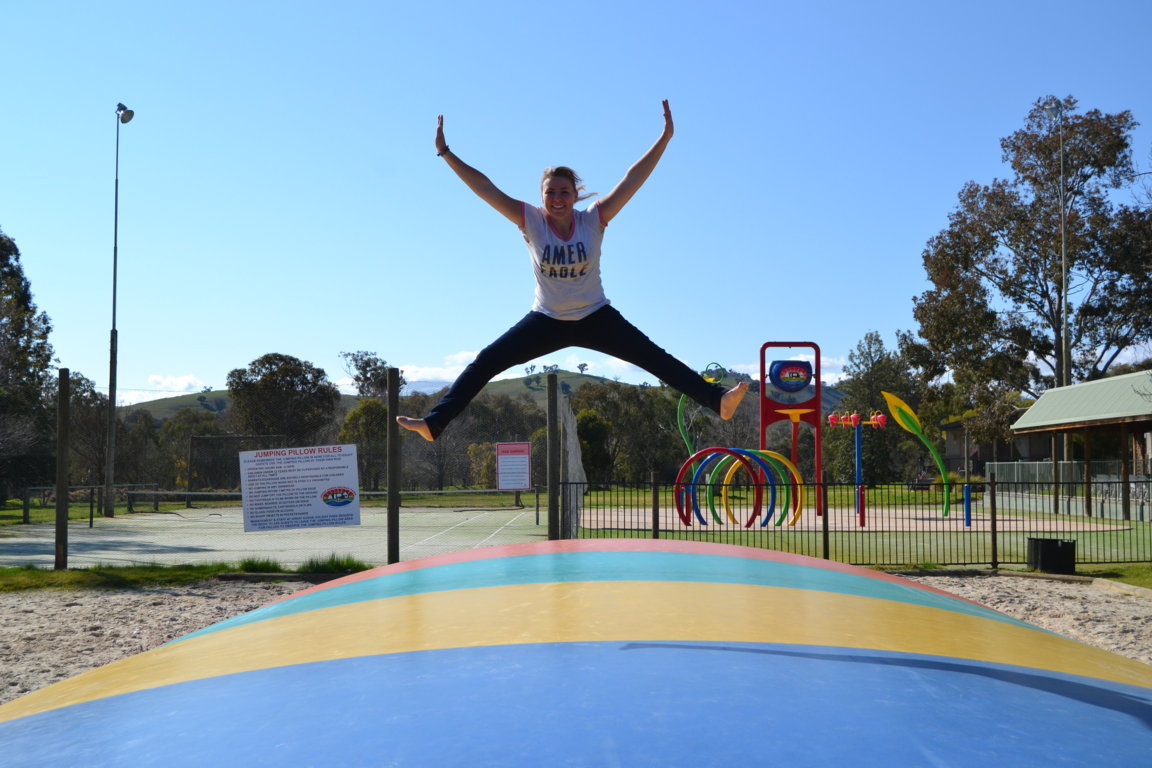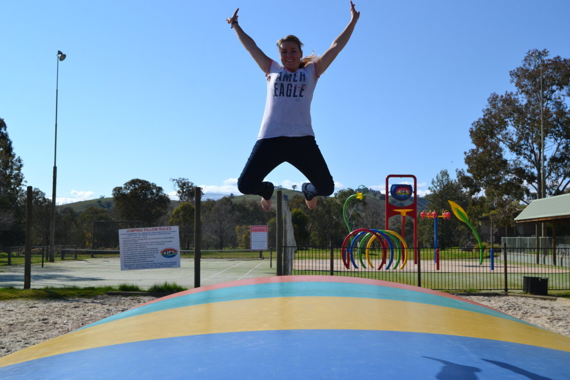 Die Springpferde stehen hier alle auf sehr großen Sandpaddocks und haben das Paradies. Es gibt 17 Reitpferde, darunter 5 Einsteller, 1 Fohlen und nochmal 9 junge Pferde die auf einer Koppel in einer Herde leben. Meine andere Chefin Jenny die durch ganz Australien fährt um Reitunterricht zu geben, war nicht da. Es gibt einen großen Springplatz, einen Waschplatz, 2 überdachte Plätze zum satteln der Pferde und einen Walker (Laufband für Pferde). Vor Andrews und Jennys Haus gibt es sogar einen Pool, wo wir auch rein dürfen.