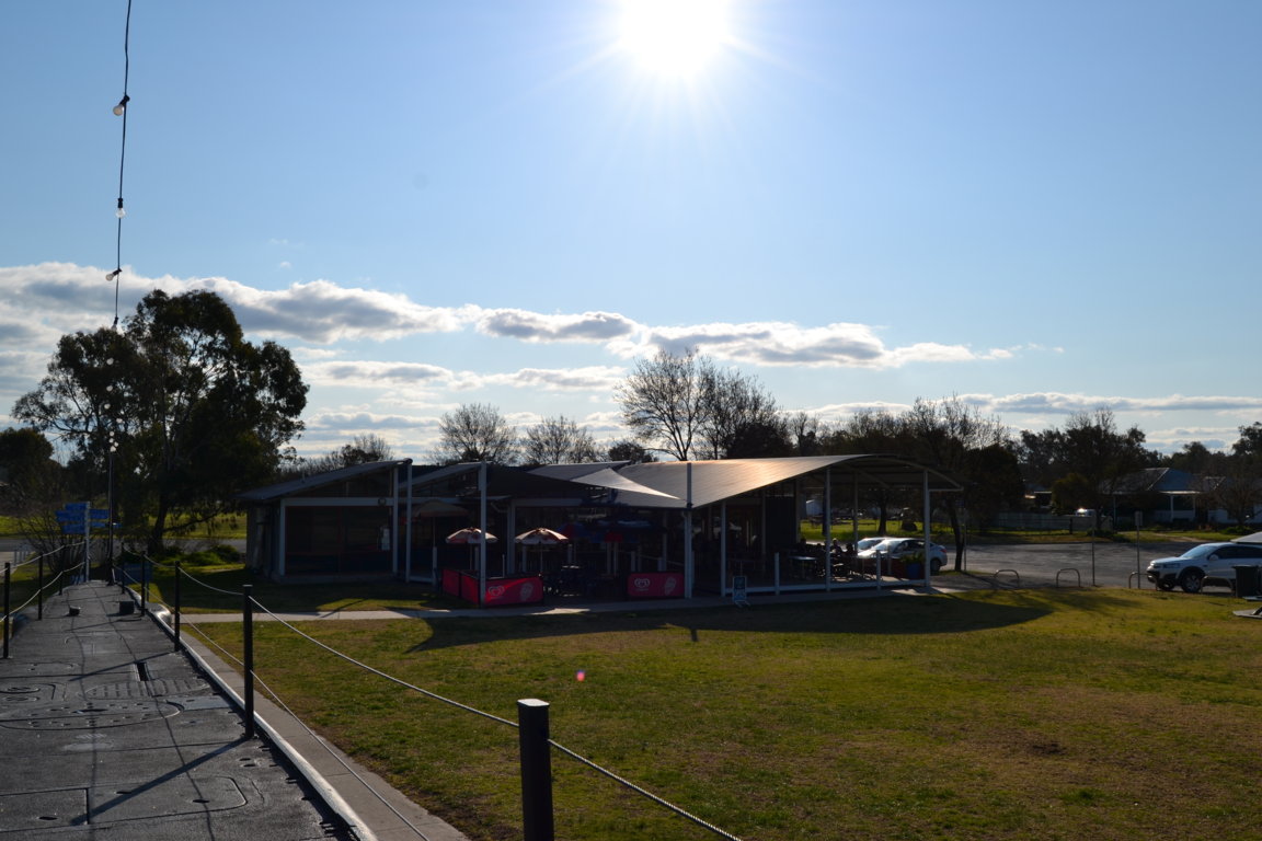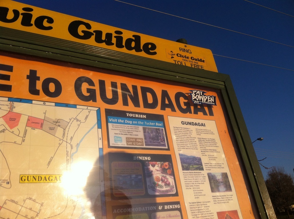 Die Stimmung war super, die Musik auch und das Wetter traumhaft. So hab ich mir das vorgestellt. Wir fuhren also der Freiheit entgegen und freuten uns immer mehr auf Sydney. Nur war ich sehr müde und nach 3 Stunden Fahrt hielten wir pünktlich zum Sonnenuntergang in Gundagai. Das ist eine relativ große Stadt mit vielen Motels und Restaurants. Im Hungry Jacks (wie Burger King in Deutschland) war ich erstaunt, dass es einen Veggieburger gab und allen schmeckte es gut.