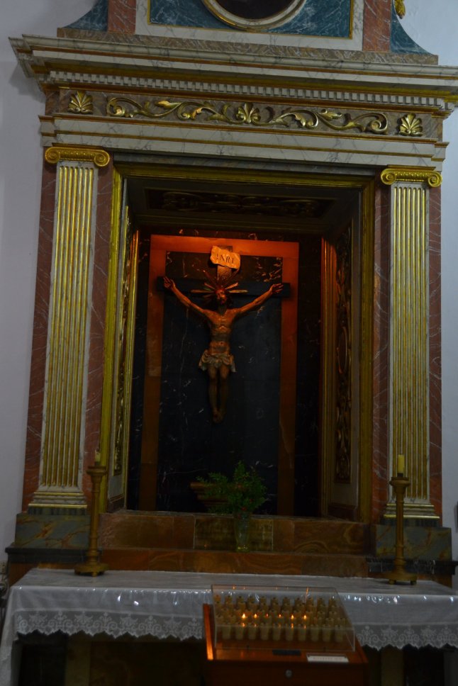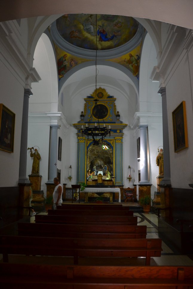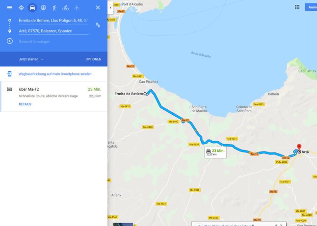 Da wir schon die ganze Zeit ein Schild mit „Betlem“ gesehen hatte, was beim schnellen Lesen aussieht wie „Betlehem“ (der Name stammt auch davon) und Oma und ich gleichermaßen neugierig sind, fuhren wir dort hin. Die Straße ist so schmal, dass kaum zwei Autos aneinander vorbei passen und wir waren uns sicher hier am Ende der Welt angekommen zu sein. Direkt am Parkplatz, wo wir natürlich die Einzigen waren, befindet sich die „Ermita de Betlem“, eine sehr gut erhaltene Kapelle. Früher war es ein Kloster, jetzt wohnt nur noch ein Mönch dort. Hinter der Kapelle befindet man sich auf 295 Metern Höhe über Colònia de Sant Pere und hat eine tolle Aussicht auf die Bucht von Alcudia.