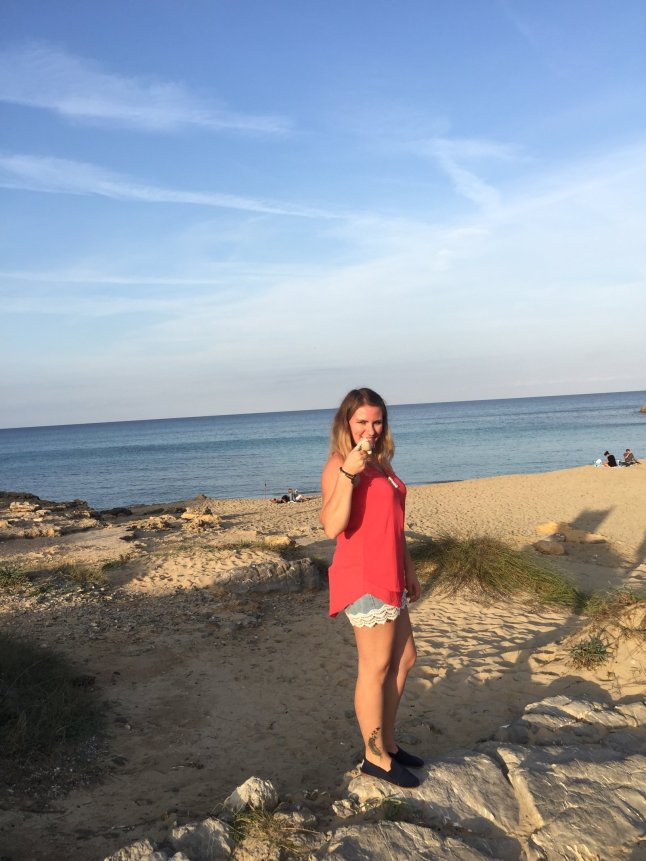 „Mitten in einer gebirgigen, unbebauten Landschaft liegt der traumhafte Sandstrand Cala Torta.“ Durch diesen Satz im Reiseführer ließ ich mich locken und hatte somit unser nächstes Ziel ausgesucht. Wir wurden zwar bereits vor „Holperpisten“ gewarnt, aber dass man dort so durchgeschüttelt wird, hatte wohl keiner von uns erwartet. Es war eine Tortur dort hinzukommen und irgendwann hörte die Straße auf und wir fuhren wörtlich über Stock (Sand) und Stein. Bis wir da waren, war uns allen schlecht und Papa verfluchte meinen Vorschlag. Die Cala Torta wird auch als eine der schönsten Badebuchten im Norden Mallorcas angepriesen und so waren die Erwartungen hoch. Wir stellten das Auto unter einen Baum und liefen eine Weile. Tatsächlich ist die Bucht sehr schön, aber unsere Erwartungen erfüllte sie jetzt nicht unbedingt. Wir genossen den schönen Blick aufs Meer und es ging dieselbe Holperpiste zurück. Wir lachten uns kaputt, weil das Auto schwankte wie beim Seegang und alles vibrierte. Bestimmt sah das ständige nicken unserer Köpfe witzig aus. Unterwegs trafen wir Ziegen die auf der Straße standen und hatten beim Sonnenuntergang perfekte Sicht aufs Meer.