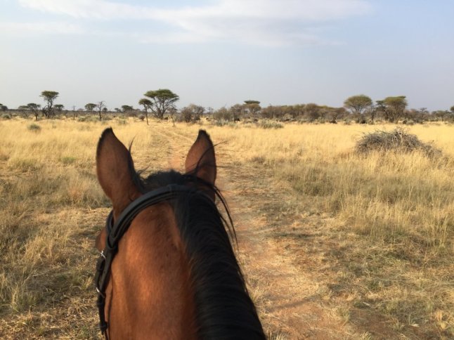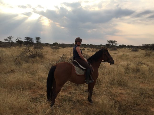 Nachmittags stand wieder eine große Challenge für mich an. Mein zweiter zweieinhalb Stunden Ritt. Diesmal war der Druck noch größer als am Vortag, denn ich hatte ein italienisches Ehepaar dabei, das kaum englisch sprach und der Weg den ich reiten sollte war richtig kompliziert. Außerdem war es ein Sonnenuntergangsritt und es galt den richtigen Platz zu finden, wo die anderen warteten. In der Pause hatte ich mir wieder die Route angeschaut und bin sogar mit einem Fahrrad den ersten kleinen Teil der Route abgefahren um mir sicher zu sein. Ich war total nervös, hatte nasse Hände und herzklopfen. Gerade bei dem Sonnenuntergangsritt wenn jeder auf einen wartet ist es wichtig, dass man pünktlich kommt. Auch diese Route bin ich noch nie davor geritten. Viva malte mir auf ein Blatt Papier auf wie es da aussieht wo ich hin muss und nach welchem Busch ich abbiegen muss. Die Zeichnung sah einleuchtend aus und ich hoffte, dass das auch in real so aussehen würde. So ritten die Italiener, das eine Mädchen vom Vortag und ich also los. Ich hatte die Stute Pewa die anscheinend als Guidepferd öfter Mal einen Satz zur Seite macht und auch mal schneller werden kann. Das war die nächste Herausforderung, denn ich bin sie davor erst einmal geritten und auch nur im Trab. Schon am Anfang fand ich den Weg nicht den ich eigentlich wollte und war viel zu schnell an der ersten Abbiegung. Leider wusste ich nicht, wie ich auf den Weg kommen sollte und ließ also den ersten Teil der Strecke komplett weg. An einem langen Feldweg galoppierten wir gemütlich, bis das Pferd der Italienerin plötzlich los schoss. Er zog an mir vorbei und sie hatte keinerlei Kontrolle mehr. Ich rief ihr zu sie solle die Zügel kürzer nehmen und sich hinsetzen, aber das verstand sie nicht. Natürlich rasten auch unsere Pferde im gestreckten Galopp hinterher. Ich hatte Sicherheitssteigbügel dran von denen der Verschluss fehlte. So waren die Steigbügel an einer Seite offen und ich verlor den Bügel. Dann machte Pewa auch noch im vollen Tempo unerwartet einen Sprung, als ob da ein Hindernis stehen würde. Danach sprang sie noch ständig zur Seite. Zum Glück blieb ich sitzen. Leider wurde keins der Pferde langsamer und das Pferd das das Mädchen ritt, war schon fast nicht mehr zu sehen, weil der Abstand so groß wurde. Erst als der Weg zu Ende war, stoppte das Pferd und auch die anderen wurden langsamer. Ich war so froh, dass nichts passierte und in so einem gestreckten Galopp bin ich davor auch noch nie galoppiert. Und das, obwohl ich schon Rennpferde geritten bin. Die Italiener fingen nach einem kurzen Schockmoment an mit Lachen und bekamen sich gar nicht mehr ein.