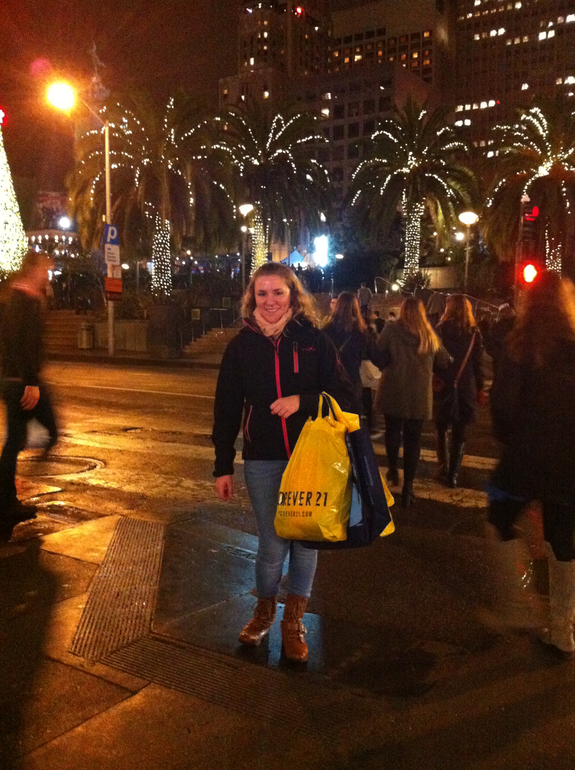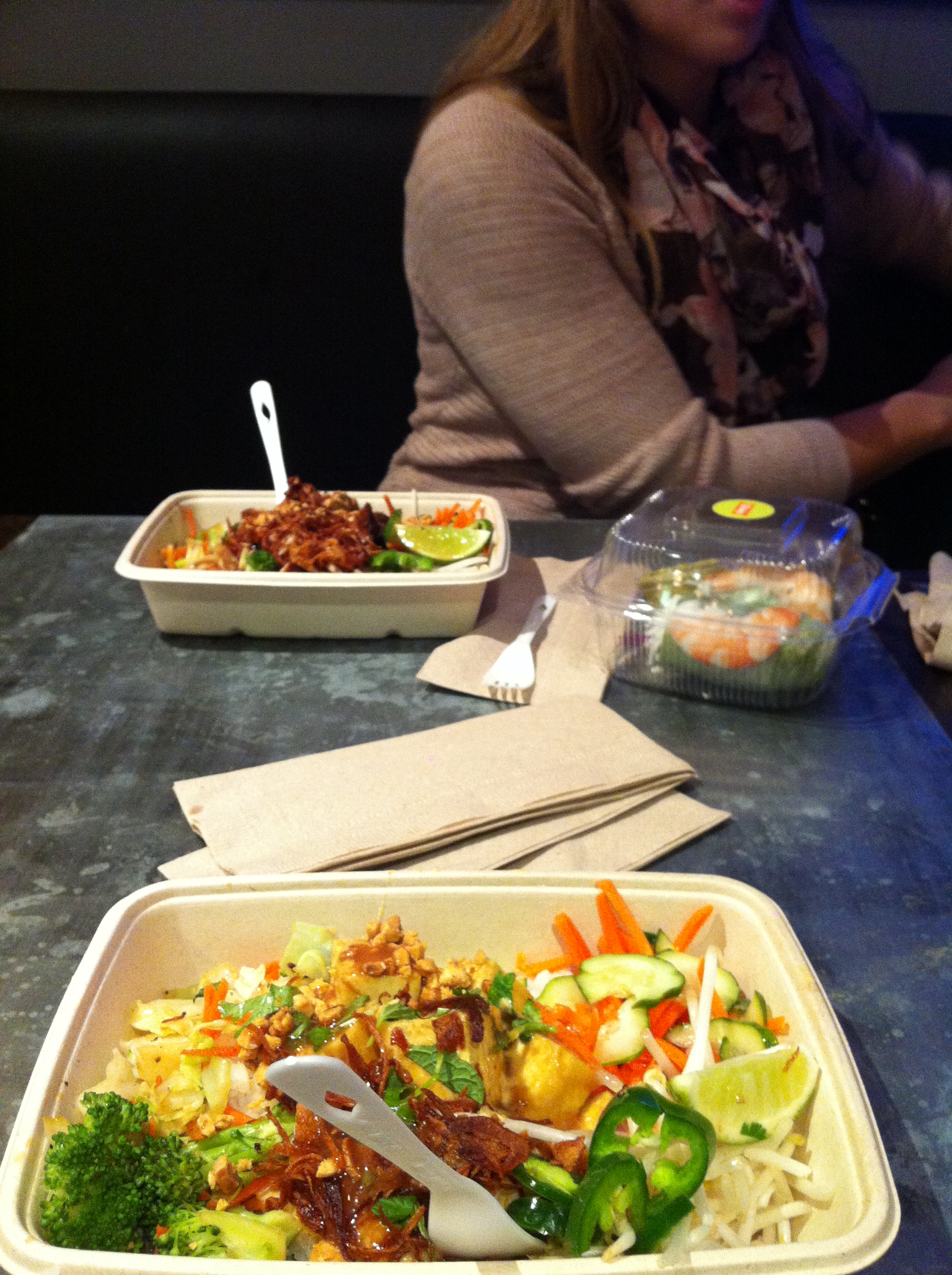 Ich ließ die Jungs allein und fuhr mit der Tram zum Hauptbahnhof. Wie so oft erst in die falsche Richtung, aber irgendwann fand ich das Shoppingoutlet. Sinje (die Kindergartenfreundin die ich diese Woche schon bei ihrer Gastfamilie besuchte) wartete im Starbucks Café auf mich. Zufällig kamen Carl und Kevin da auch rein. Alle zusammen zogen wir dann im Shoppingoutlet los. Schon beim ersten Laden gaben die Jungs auf und gingen zurück zum Hostel. Sinje und mein Shoppingfieber war ausgebrochen. Es zog uns von einem in den nächsten Laden und überall war es so schön günstig. Sehr verführerisch. Trotzdem hielt ich Stand (ich muss auf mein Geld achten) und kaufte mir nur eine lange Hose, weil ich keine mehr hatte für umgerechnet unglaubliche 6 Euro. Sinje fand auch was und wir hatten viel Spaß. Shoppen macht hungrig und deswegen machten wir Essen ausfindig Von dem einen Australier den ich vor ein paar Tagen getroffen habe, hatte ich den Tipp für eine vegetarische Würstchenbude bekommen. Auch Sinje traute sich das „vegetarische Fleisch“ bei „Lord of the Fries“ (Herr der Pommes) zu probieren. Mein Burger mit Sojafleisch und Tofu schmeckte nicht schlecht und auch Sinje konnte ihres genießen. Außerdem gab es Pommes aus Süßkartoffeln bei ihr dazu.