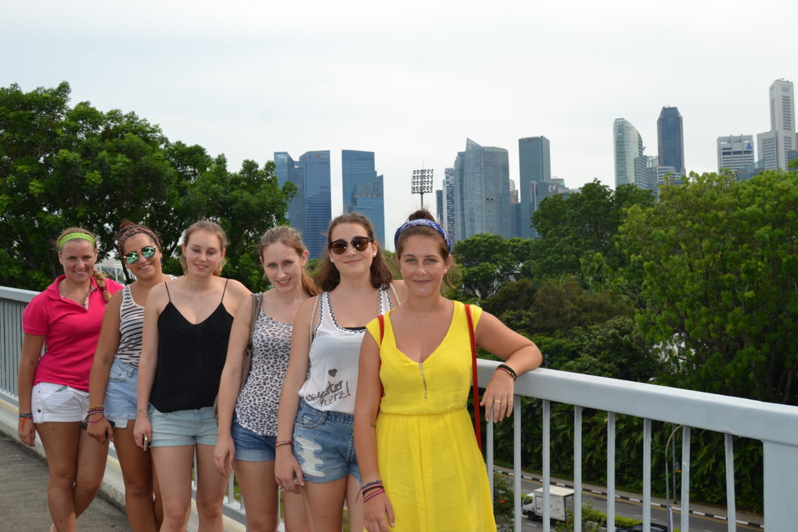 Skyline von Singapur mit der Mädelstruppe und Schäfchen