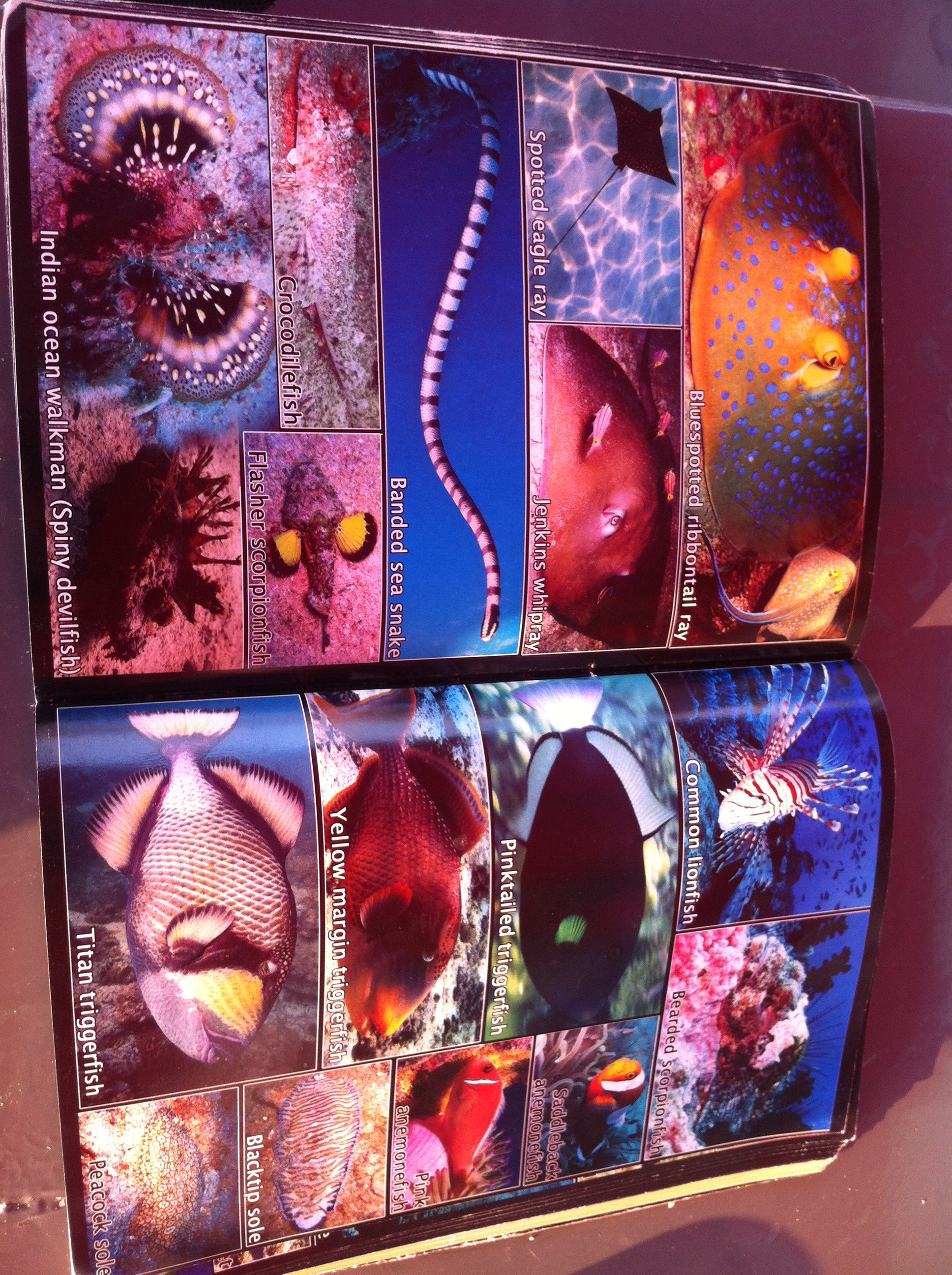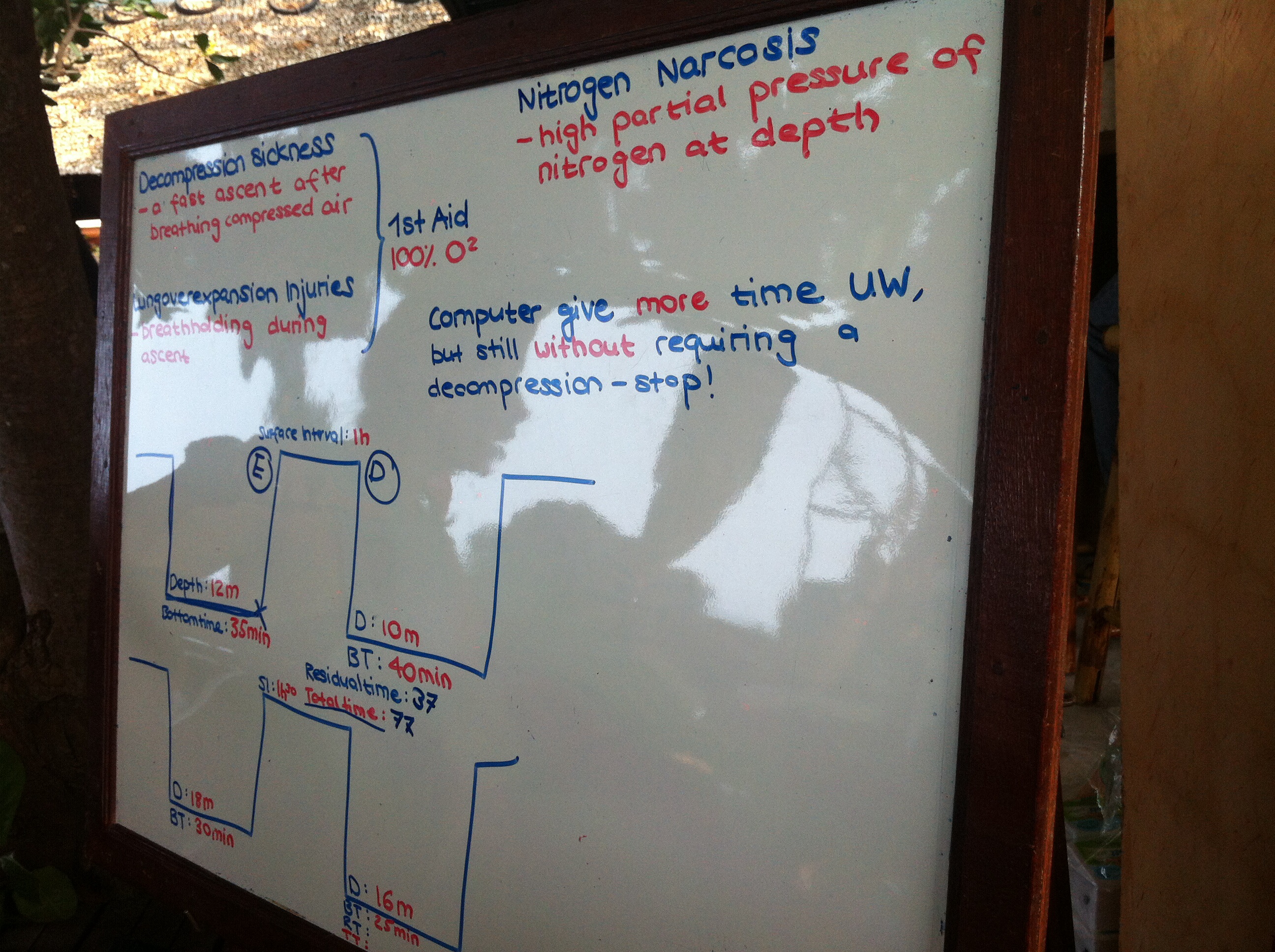 Beim nächsten Tauchgang kamen dann der Computer und Kompass zum Einsatz. Erst mussten wir mit unserem Buddy mit Hilfe des Kompasses ein paar Meter schwimmen, 180 grad drehen und dann genau am selben Punkt zurück kommen und dann ein großes Rechteck schwimmen, bis man die Gruppe nicht mehr gesehen hat. Wenn man noch nie einen Kompass gesehen hat, ist das gar nicht so leicht: Man sieht unter Wasser nur ein paar Meter weit, muss auf der selben Tiefe bleiben, ohne Worte mit dem Buddy kommunizieren, auf Fische und Korallen aufpassen und dann zur Gruppe zurück finden. Auch das war für uns aber machbar und dann kam die große Steigerung: Phil verließ uns komplett und wir mussten nun mit einer auf einem Brett aufgezeichneten Karte und dem Kompass zurück zum Boot finden. Man muss dabei an so vieles denken: Ist noch genug Luft in der Flasche?, Strömungen, Richtung, richtige Tiefe, zusammen bleiben, gefährliche Fische, Tauchzeit, usw.
