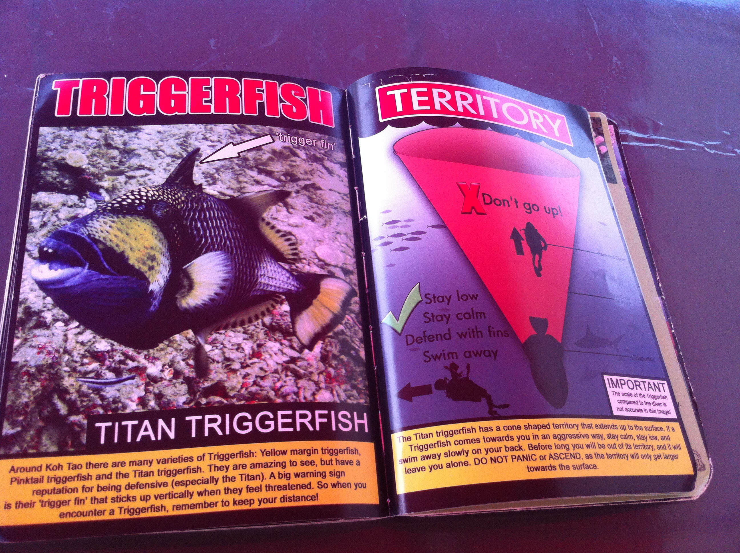 Gleich am Anfang ist uns ein Triggerfish begegnet und ich hab mich an Chris festgehalten. Zum Glück hat der Fisch uns nicht bemerkt. Als wir nach einigen Minuten dachten wir sind in der Nähe vom Boot, ließen wir unsere Sicherheitsflagge aufsteigen, machten unseren Sicherheitsstopp und stiegen langsam auf zur Oberfläche. Direkt am Boot sind wir zwar nicht rausgekommen, aber ganz in der Nähe. Das hat total viel Spaß gemacht. Ohne Instructor und selbstständig die Tiefen des Meeres zu erkunden ist was total tolles und wenn man es geschafft hat, freut man sich total. Unser 4er Team hat gut zusammen gehalten.
