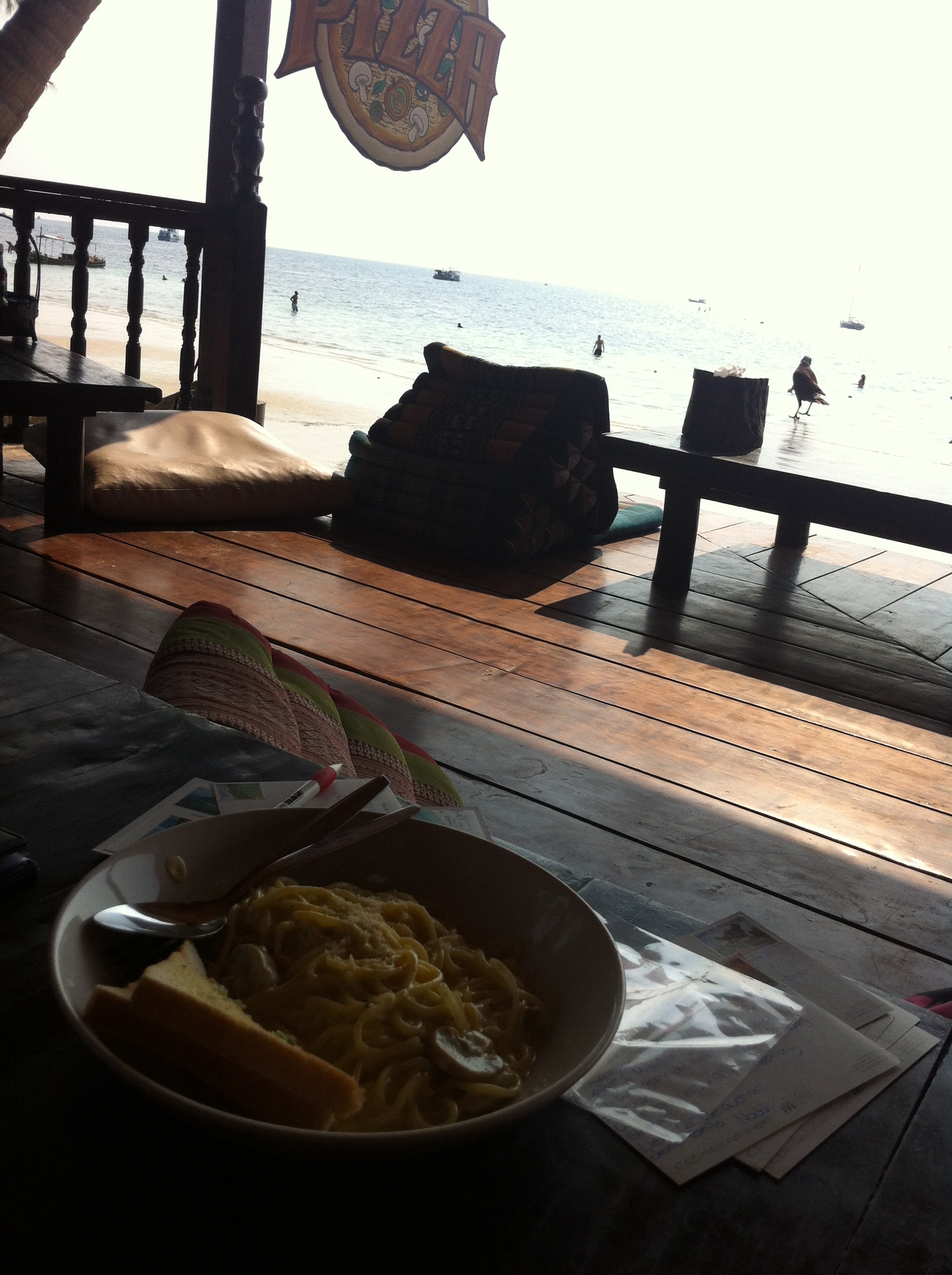 Beim Weg vom Klassenzimmer ins Resort kaufte ich mir Pad Thai und hatte das erste Mal hier richtig Angst. Ich musste durch einen Wald der komplett dunkel und verlassen war, wusste den Weg nicht richtig und dachte an die vielen ungeklärten Morde hier in letzter Zeit. Der Weg kam mir ewig vor und ich musste immer aufpassen nicht über die Wurzeln zu stolpern. Im Resort traf ich keinen Mensch an und ich hab hier nicht mal Internet. Am Pool saß ich dann mutterseelenallein, aß das Pad Thai und hatte zum ersten Mal in diesem Urlaub Stille. Trotzdem fühlte ich mich nicht allein, weil ich wusste ich würde beim Tauchen neue, nette Menschen kennen lernen.